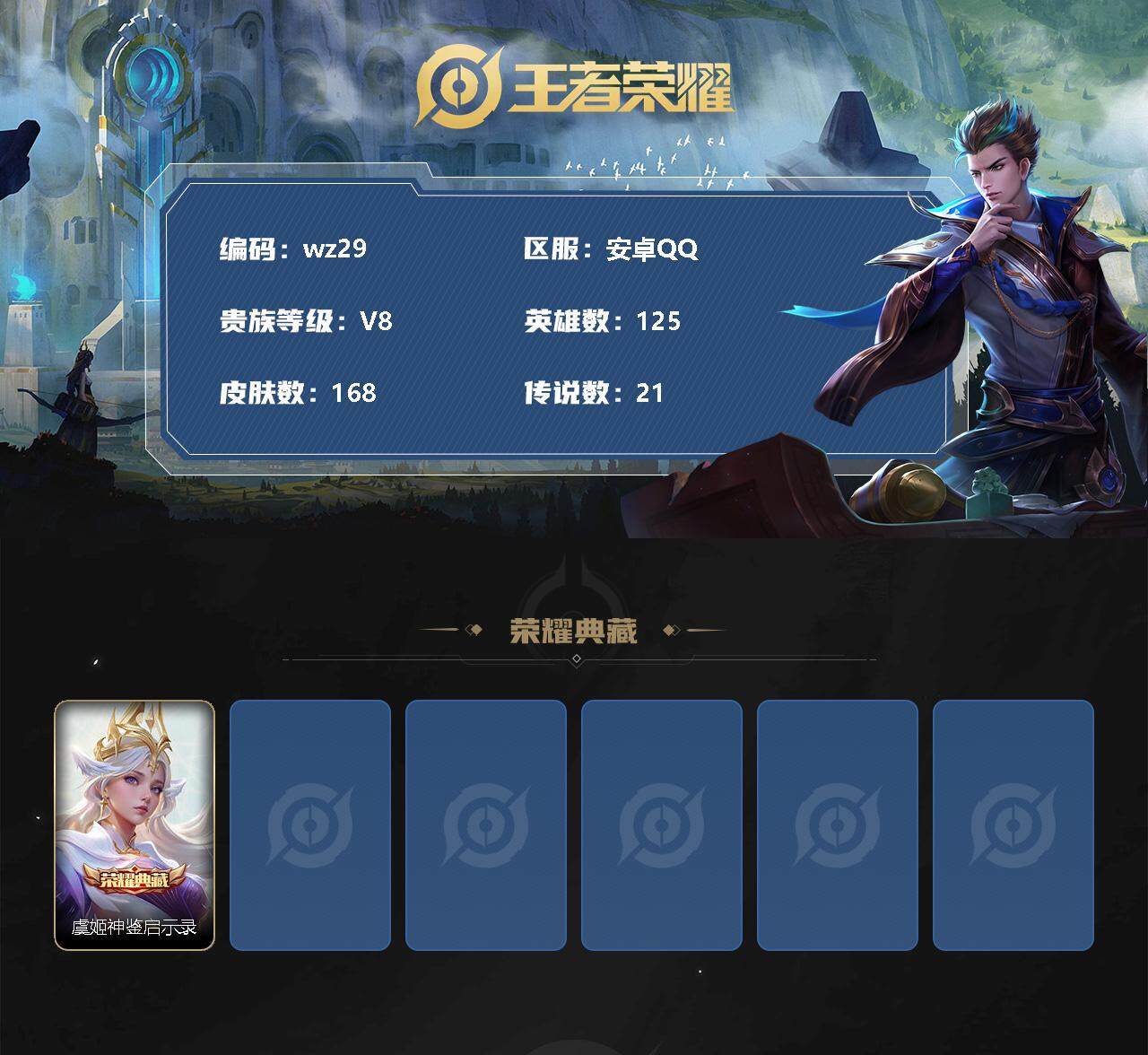 【账号佳】【王者荣耀】【编号:3340096】【可二次实名】【wz29】【商品标题】:安卓Q-V8-至尊星耀IV段位-125英雄-168皮肤-1典藏-0珍品无双-0无双-0珍品传说-21传说-37史诗 【荣耀典藏】:虞姬神鉴启示录 【传说皮肤】:杨玉环星之鸣奏,司空震愿照山河定,女娲愿照千秋盛,妲己愿照众生和,澜愿照九州拓,云缨幻光神枪,夏洛特浮生妄,李白诗剑行,狄仁杰神器狴犴令,孙尚香音你闪耀,孙策末日机甲,鲁班七号寅虎瑞焰,赵云淬星耀世,李元芳飞鸢探春,诸葛亮时雨天司,虞姬启明星使,孙悟空零号赤焰,后羿黄金射手座,貂蝉仲夏夜之梦,孙尚香末日机甲,孙悟空地狱火 【限定皮肤】:白起狰,蔡文姬夏日便利店,虞姬夏日便利店,姜子牙天穹之誓,狄仁杰阴阳师,虞姬凯尔特女王,赵云皇家上将,赵云百木心枪,嬴政白昼王子,鲁班七号狮舞东方,鲁班七号寅虎瑞焰,孙膑妖精王,扁鹊炼金王,芈月重明,吕布猎兽之王,元歌无心,夏侯惇朔风刀,曹操烛龙,典韦穷奇,马可波罗山海玄木吟,狄仁杰魔术师,狄仁杰万华元夜,狄仁杰神器狴犴令,达摩沙漠行僧,项羽海滩派对,老夫子圣诞老人,老夫子醍醐杖,程咬金演武夺筹,韩信傲雪梅枪,兰陵王金庭之子,亚瑟狮心王,孙悟空大圣娶亲,孙悟空零号赤焰,牛魔御旌,李元芳云中旅人,虞姬启明星使,钟馗神迹守卫,钟馗驱傩正仪,杨玉环遇见飞天,蔡文姬繁星吟游,太乙真人饕餮,鬼谷子原初探秘者,诸葛亮时雨天司,黄忠烈魂,百里守约朱雀志,弈星混沌棋,沈梦溪大漠名商,明世隐疑决卦,狂铁御狮,米莱狄御霄,盾山御銮,上官婉儿梁祝,夏洛特浮生妄 【年限皮肤】:百里守约朱雀志,鲁班七号寅虎瑞焰,诸葛亮时雨天司,黄忠烈魂,马可波罗山海玄木吟 【赛季限定】:孙膑妖精王,扁鹊炼金王,白起狰,芈月重明,夏侯惇朔风刀,曹操烛龙,典韦穷奇,狄仁杰万华元夜,达摩沙漠行僧,老夫子醍醐杖,程咬金演武夺筹,兰陵王金庭之子,亚瑟狮心王,牛魔御旌,李元芳云中旅人,虞姬凯尔特女王,钟馗驱傩正仪,太乙真人饕餮,鬼谷子原初探秘者,弈星混沌棋,沈梦溪大漠名商,明世隐疑决卦,狂铁御狮,米莱狄御霄,盾山御銮,姜子牙天穹之誓 【战令限定】:蔡文姬夏日便利店,虞姬夏日便利店,嬴政白昼王子,鲁班七号狮舞东方,吕布猎兽之王,钟馗神迹守卫 【史诗皮肤】:鲁班七号电玩小子,赵云皇家上将,赵云未来纪元,貂蝉圣诞恋歌,老夫子圣诞老人,王昭君偶像歌手,狄仁杰魔术师,宫本武藏鬼剑武藏,妲己魅力维加斯,妲己女仆咖啡,李白千年之狐,刘邦德古拉伯爵,小乔缤纷独角兽,兰陵王暗隐猎兽者,诸葛亮黄金分割率,铠曙光守护者,阿轲节奏热浪,杨玉环遇见飞天,嬴政白昼王子,百里守约朱雀志,孙悟空大圣娶亲,鲁班七号狮舞东方,狄仁杰鹰眼统帅,上官婉儿梁祝,蔡文姬繁星吟游,黄忠烈魂,安琪拉时之奇旅,韩信傲雪梅枪,夏洛特永昼,赵云百木心枪,元歌无心,马可波罗山海玄木吟,蔡文姬夏日便利店,马可波罗星界特工,赵怀真器灵浮梦炉,阿轲化蝶舞,公孙离涂山容容 【其他皮肤】:项羽海滩派对,韩信教廷特使,露娜哥特玫瑰,阿轲爱心护理,程咬金星际陆战队,牛魔西部大镖客,武则天东方不败,扁鹊化身博士,妲己少女阿狸,亚瑟死亡骑士,达摩拳王,花木兰兔女郎,张飞五福同心,甄姬花好人间,宫本武藏万象初新,亚瑟狮心王,后羿阿尔法小队,狄仁杰阴阳师,刘备纽约教父,孙膑妖精王,刘备汉昭烈帝,扁鹊炼金王,关羽龙腾万里,虞姬凯尔特女王,白起狰,钟无艳海滩丽影,太乙真人饕餮,曹操烛龙,王昭君幻想奇妙夜,芈月重明,老夫子功夫老勺,牛魔制霸全明星,孙尚香沉稳之力,典韦穷奇,诸葛亮掌控之力,李白敏锐之力,狂铁御狮,苏烈坚韧之力,米莱狄御霄,吕布猎兽之王,明世隐虹云星官,张良幽兰居士,庄周奇妙博物学,牛魔御旌,小乔丁香结,吕布野性能量,钟馗神迹守卫,盾山御銮,沈梦溪鲨炮海盗猫,夏侯惇朔风刀,弈星混沌棋,哪吒次元突破,鲁班七号黑桃队长,明世隐疑决卦,老夫子醍醐杖,廉颇无尽征程,鬼谷子原初探秘者,狄仁杰万华元夜,刘禅秘密基地,程咬金演武夺筹,钟馗驱傩正仪,鲁班大师乓乓大师,达摩沙漠行僧,兰陵王金庭之子,沈梦溪大漠名商,李元芳云中旅人,猪八戒潮玩探月行,姬小满零食大作战,廉颇功夫炙烤,姜子牙天穹之誓,虞姬夏日便利店,太乙真人谧流熔炉,西施雪境奇遇,姜子牙星梦巡礼,达摩爆裂喵拳,明世隐景韶洛都,戈娅玫蓝誓约,刘备浪漫序章,钟馗虚灵犬护,苏烈春野闲踪,甄姬逆浪荇歌,庄周锦麟游梦,莱西奥踏浪烽翎,鲁班七号福禄兄弟,高渐离金属狂潮,花木兰剑舞者,狄仁杰锦衣卫,小乔万圣前夜,孙悟空西部大镖客,周瑜海军大将,兰陵王隐刃,李白范海辛,雅典娜战争女神,太乙真人圆桌骑士,诸葛亮星航指挥官,黄忠芝加哥教父,干将莫邪第七人偶,铠龙域领主,百里守约绝影神枪,米莱狄精准探案法,元歌午夜歌剧院,伽罗花见巫女,沈梦溪棒球奇才,云中君荷鲁斯之眼,马超幸存者,蒙犽归虚梦演,镜冰刃幻境,澜