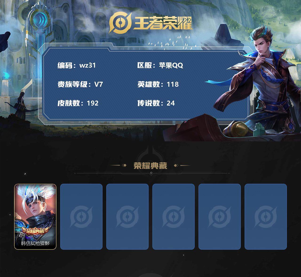 【账号佳】【王者荣耀】【编号:3340103】【可二次实名】【wz31】【商品标题】:苹果Q-V7-永恒钻石V段位-118英雄-192皮肤-1典藏-0珍品无双-0无双-0珍品传说-24传说-54史诗 【荣耀典藏】:韩信弑枪猎影 【传说皮肤】:兰陵王影龙天霄,吕布遇见神鼓,诸葛亮鹤羽星尊,花木兰燃星之曲,孙悟空齐天大圣,李信山海炽霜斩,吕布怒海麟威,马超无双飞将,蔡文姬花朝如约,赵云淬星耀世,王昭君乞巧织情,兰陵王默契交锋,公孙离祈雪灵祝,铠绛天战甲,虞姬启明星使,曜云鹰飞将,李信一念神魔,刘备时之恋人,貂蝉猫影幻舞,虞姬云霓雀翎,梦奇胖达荣荣,貂蝉仲夏夜之梦,宫本武藏地狱之眼,孙悟空地狱火 【限定皮肤】:蔡文姬夏日便利店,虞姬夏日便利店,姜子牙天穹之誓,杨戬破阵退雄兵,狄仁杰阴阳师,赵云皇家上将,钟无艳超时空战士,扁鹊奇幻香踪,吕布遇见神鼓,元歌无心,甄姬落雪兰心,马可波罗山海玄木吟,狄仁杰魔术师,达摩沙漠行僧,项羽海滩派对,韩信傲雪梅枪,兰陵王默契交锋,兰陵王影龙天霄,兰陵王金庭之子,花木兰默契交锋,花木兰燃星之曲,孙悟空至尊宝,孙悟空齐天大圣,李元芳匿光侦查者,李元芳云中旅人,虞姬启明星使,钟馗神迹守卫,杨戬潮玩骑兵,鬼谷子五谷丰年,诸葛亮鹤羽星尊,公孙离祈雪灵祝,公孙离玉兔公主,沈梦溪匿光破解者,裴擒虎李小龙,裴擒虎擒涛扼浪,李信山海炽霜斩,嫦娥暖冬兔眠,鲁班大师探海日志,桑启海盐诗旅,暃星界游侠,艾琳流音漫舞,司空震地狱燃心,阿古朵江河有灵,张良古海寻踪,刘邦剑破天穹,镜青焰无极,项羽苍威无极,刘备异域游侠,芈月浮光幕影,周瑜熔金海岸 【年限皮肤】:公孙离祈雪灵祝,马可波罗山海玄木吟,李信山海炽霜斩 【赛季限定】:达摩沙漠行僧,兰陵王金庭之子,张良古海寻踪,李元芳云中旅人,裴擒虎擒涛扼浪,鲁班大师探海日志,桑启海盐诗旅,刘邦剑破天穹,姜子牙天穹之誓 【战令限定】:蔡文姬夏日便利店,虞姬夏日便利店,钟无艳超时空战士,扁鹊奇幻香踪,甄姬落雪兰心,艾琳流音漫舞,钟馗神迹守卫,杨戬潮玩骑兵,嫦娥暖冬兔眠,司空震地狱燃心,暃星界游侠,镜青焰无极,项羽苍威无极 【史诗皮肤】:鲁班七号电玩小子,项羽苍穹之光,露娜紫霞仙子,赵云皇家上将,赵云未来纪元,貂蝉圣诞恋歌,甄姬冰雪圆舞曲,王昭君偶像歌手,狄仁杰魔术师,宫本武藏鬼剑武藏,孙尚香水果甜心,嬴政暗夜贵公子,妲己魅力维加斯,妲己女仆咖啡,曹操幽灵船长,张飞乱世虎臣,韩信白龙吟,孙悟空至尊宝,诸葛亮黄金分割率,雅典娜冰冠公主,铠曙光守护者,刘禅天才门将,李元芳逐浪之夏,程咬金功夫厨神,阿轲节奏热浪,孙策猫狗日记,狄仁杰鹰眼统帅,娜可露露晚萤,瑶遇见神鹿,孙尚香时之恋人,裴擒虎李小龙,花木兰默契交锋,百里玄策热力回旋,安琪拉时之奇旅,司马懿暗渊魔法,韩信傲雪梅枪,夏洛特永昼,公孙离玉兔公主,澜赏金猎手,钟无艳超时空战士,鬼谷子五谷丰年,元歌无心,暃星界游侠,马可波罗山海玄木吟,扁鹊奇幻香踪,沈梦溪匿光破解者,百里守约真我赫兹,李元芳匿光侦查者,司空震地狱燃心,阿古朵江河有灵,镜青焰无极,芈月浮光幕影,蔡文姬夏日便利店,后羿石田雨龙 【其他皮肤】:项羽海滩派对,韩信教廷特使,韩信街头霸王,露娜哥特玫瑰,阿轲爱心护理,赵云忍炎影,芈月红桃皇后,程咬金星际陆战队,白起白色死神,扁鹊化身博士,扁鹊救世之瞳,宫本武藏未来纪元,安琪拉玩偶对对碰,孙膑天使之翼,姜子牙时尚教父,妲己少女阿狸,典韦黄金武士,亚瑟死亡骑士,达摩拳王,花木兰兔女郎,甄姬花好人间,后羿阿尔法小队,狄仁杰阴阳师,刘备汉昭烈帝,关羽龙腾万里,狂铁命运角斗场,老夫子功夫老勺,李白敏锐之力,明世隐虹云星官,小乔丁香结,钟馗神迹守卫,刘禅秘密基地,鲁班大师乓乓大师,达摩沙漠行僧,兰陵王金庭之子,甄姬落雪兰心,李元芳云中旅人,桑启海盐诗旅,嫦娥暖冬兔眠,海月幻泉雾影,猪八戒潮玩探月行,牛魔牛运亨通,白起乐园追猎者,赵怀真太极少年,裴擒虎擒涛扼浪,杨戬潮玩骑兵,太乙真人劲辣红锅,莱西奥西部游侠,鲁班大师探海日志,姬小满零食大作战,李元芳妄想特派,艾琳流音漫舞,张良古海寻踪,钟无艳聚星闪耀,海月王牌新星,亚连破局者,兰陵王幻夜行动,刘邦剑破天穹,项羽苍威无极,大司命暗都幽影,刘备异域游侠,杨戬破阵退雄兵,姜子牙天穹之誓,周瑜熔金海岸,虞姬夏日便利店,东皇太一噬灭天穹,白起死霸装,钟无艳生化警戒,貂蝉异域舞娘,老夫子潮流仙人,曹操超能战警,孙膑未来旅行,孙悟空西部大镖客,周瑜海军大将,后羿精灵王,刘禅英喵野望,兰陵王隐刃,李白范海辛,钟馗地府判官,李元芳特种部队,刘邦圣殿之光,虞姬加勒比小姐,关羽天启骑士,蔡文姬蔷薇王座,雅典娜战争女神,马可波罗激情绿茵,苍维京掠夺者,杨戬埃及法老,哪吒三太子,大乔伊势巫女,干将莫邪第七人偶,铠龙域领主,百里守约绝影神枪,苏烈爱与和平,梦奇美梦成真,明世隐占星师,公