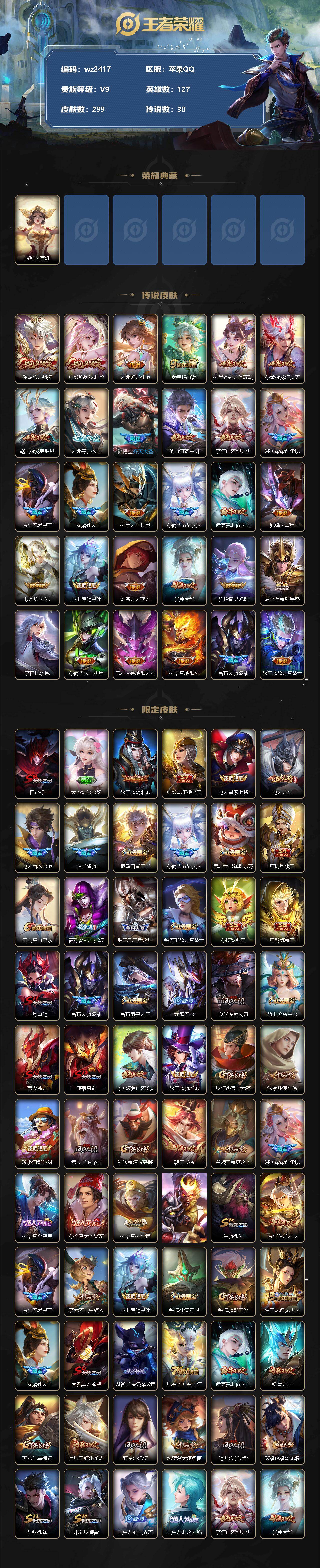 【账号佳】【王者荣耀】【编号:3340461】【可二次实名】【wz2417】苹果Q-V9-永恒钻石I段位-127英雄-299皮肤-0典藏-0珍品无双-0无双-0珍品传说-30传说-71史诗 【英雄全皮】:钟馗全皮,影全皮 【荣耀典藏】:武则天英雄 【传说皮肤】:澜愿照九州拓,虞姬愿照岁时盈,云缨幻光神枪,桑启鸣野蒿,孙尚香乘龙问璇玑,孙策乘龙淬吴钩,赵云乘龙铭钟鼎,云缨鹤归松栖,孙悟空齐天大圣,曜山海苍雷引,李信山海炽霜斩,娜可露露前尘镜,后羿无尽星芒,女娲补天,孙策末日机甲,孙尚香异界灵契,诸葛亮时雨天司,铠绛天战甲,镜炽阳神光,虞姬启明星使,刘备时之恋人,伽罗太华,貂蝉猫影幻舞,后羿黄金射手座,李白凤求凰,孙尚香末日机甲,宫本武藏地狱之眼,孙悟空地狱火,吕布天魔缭乱,狄仁杰超时空战士 【限定皮肤】:白起狰,大乔绒语心约,狄仁杰阴阳师,虞姬凯尔特女王,赵云皇家上将,赵云龙胆,赵云百木心枪,墨子降魔,嬴政白昼王子,孙尚香异界灵契,鲁班七号狮舞东方,庄周蜃楼王,庄周高山流水,高渐离死亡摇滚,钟无艳王者之锤,钟无艳超时空战士,孙膑妖精王,扁鹊炼金王,芈月重明,吕布天魔缭乱,吕布猎兽之王,元歌无心,夏侯惇朔风刀,甄姬落雪兰心,曹操烛龙,典韦穷奇,马可波罗山海玄木吟,狄仁杰魔术师,狄仁杰万华元夜,达摩沙漠行僧,项羽海滩派对,老夫子醍醐杖,程咬金演武夺筹,韩信飞衡,兰陵王金庭之子,娜可露露前尘镜,孙悟空至尊宝,孙悟空大圣娶亲,孙悟空孙行者,孙悟空齐天大圣,牛魔御旌,后羿辉光之辰,后羿无尽星芒,李元芳云中旅人,虞姬启明星使,钟馗神迹守卫,钟馗驱傩正仪,杨玉环遇见飞天,女娲补天,太乙真人饕餮,鬼谷子原初探秘者,鬼谷子五谷丰年,诸葛亮时雨天司,铠青龙志,苏烈千军破阵,百里守约朱雀志,弈星混沌棋,沈梦溪大漠名商,明世隐疑决卦,裴擒虎擒涛扼浪,狂铁御狮,米莱狄御霄,云中君纤云弄巧,云中君时之祈愿,李信山海炽霜斩,伽罗太华,盾山御銮,嫦娥暖冬兔眠,曜山海苍雷引,鲁班大师探海日志,桑启海盐诗旅,暃星界游侠,艾琳女武神,云缨鹤归松栖,张良古海寻踪,蒙犽百解令,蒙恬荣光圣徽,鬼谷子天穹祈灯,安琪拉乘龙聚宝船,孙尚香乘龙问璇玑,孙策乘龙淬吴钩,赵云乘龙铭钟鼎,刘邦剑破天穹 【年限皮肤】:百里守约朱雀志,铠青龙志,李白凤求凰,后羿辉光之辰,诸葛亮时雨天司,伽罗太华,韩信飞衡,马超神威,赵云龙胆,马可波罗山海玄木吟,李信山海炽霜斩,曜山海苍雷引,安琪拉乘龙聚宝船,孙尚香乘龙问璇玑,孙策乘龙淬吴钩,赵云乘龙铭钟鼎 【赛季限定】:庄周蜃楼王,孙膑妖精王,扁鹊炼金王,白起狰,芈月重明,夏侯惇朔风刀,曹操烛龙,典韦穷奇,狄仁杰万华元夜,达摩沙漠行僧,老夫子醍醐杖,程咬金演武夺筹,兰陵王金庭之子,张良古海寻踪,牛魔御旌,李元芳云中旅人,虞姬凯尔特女王,钟馗驱傩正仪,太乙真人饕餮,鬼谷子原初探秘者,苏烈千军破阵,弈星混沌棋,沈梦溪大漠名商,明世隐疑决卦,裴擒虎擒涛扼浪,狂铁御狮,米莱狄御霄,盾山御銮,鲁班大师探海日志,桑启海盐诗旅,鬼谷子天穹祈灯,蒙恬荣光圣徽,刘邦剑破天穹 【战令限定】:嬴政白昼王子,鲁班七号狮舞东方,钟无艳超时空战士,吕布猎兽之王,甄姬落雪兰心,钟馗神迹守卫,嫦娥暖冬兔眠,暃星界游侠 【史诗皮肤】:鲁班七号电玩小子,露娜紫霞仙子,阿轲暗夜猫娘,钟无艳王者之锤,赵云皇家上将,貂蝉圣诞恋歌,甄姬冰雪圆舞曲,王昭君偶像歌手,狄仁杰魔术师,廉颇地狱岩魂,宫本武藏鬼剑武藏,孙尚香水果甜心,妲己魅力维加斯,墨子龙骑士,墨子金属风暴,吕布圣诞狂欢,刘禅绅士熊喵,曹操幽灵船长,李白千年之狐,孙悟空至尊宝,花木兰水晶猎龙者,夏侯惇乘风破浪,小乔缤纷独角兽,兰陵王暗隐猎兽者,诸葛亮黄金分割率,亚瑟心灵战警,雅典娜冰冠公主,安琪拉心灵骇客,后羿辉光之辰,百里守约特工魅影,刘禅天才门将,李元芳逐浪之夏,程咬金功夫厨神,阿轲节奏热浪,杨玉环遇见飞天,嬴政白昼王子,孙策猫狗日记,铠青龙志,百里守约朱雀志,孙悟空大圣娶亲,伽罗箭羽风息,鲁班七号狮舞东方,狄仁杰鹰眼统帅,公孙离无限星赏官,韩信飞衡,不知火舞魅语,橘右京修罗,马超神威,赵云龙胆,孙尚香时之恋人,云中君纤云弄巧,西施诗语江南,蒙犽龙鼓争鸣,钟馗乐园奇幻夜,孙悟空孙行者,庄周高山流水,云中君时之祈愿,夏洛特永昼,赵云百木心枪,钟无艳超时空战士,鬼谷子五谷丰年,元歌无心,墨子降魔,暃星界游侠,马可波罗山海玄木吟,蒙犽百解令,蒙恬荣光圣徽,安琪拉乘龙聚宝船,牛魔星界战将,阿轲化蝶舞,公孙离涂山容容 【其他皮肤】:项羽海滩派对,韩信教廷特使,韩信街头霸王,阿轲致命风华,达摩大发明家,赵云白执事,赵云忍炎影,芈月红桃皇后,艾琳女武神,程咬金星际陆战队,程咬金爱与正义,白起白色死神,牛魔西部大镖客,扁鹊化身博士,扁鹊救世之瞳,宫本武藏未来纪元,安琪拉玩偶对对碰,孙膑天使之翼,姜子牙时尚教