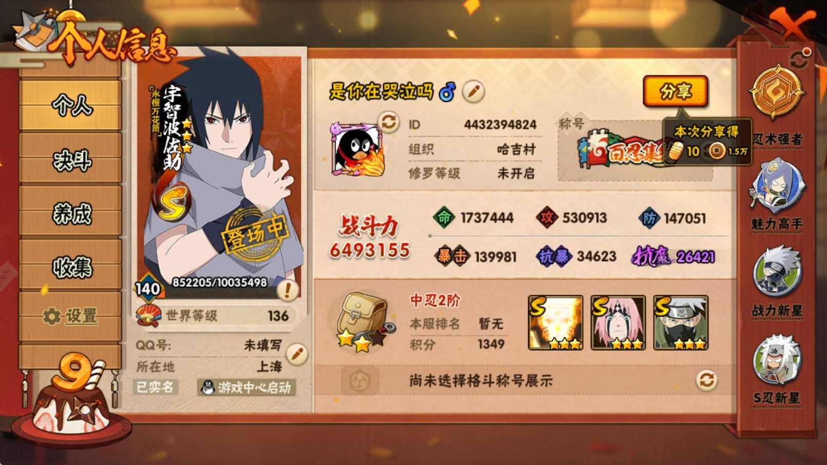 【账号佳】【火影忍者】【编号:182209】【可二次实名】r46170 可二次 安卓qq《3239区》《8s/24a》《九喇嘛鸣人+永恒佐助+忍战樱+须佐卡卡西+舞之豪杰自来也+波风水门+秽土解斑+天道佩恩》《干柿鬼鲛+迈特凯+猿飞阿斯玛+宇智波泉奈+忍战丁次+忍战宁次+青年艾+青年长门+蝎》各种道具详情看截图、低价出售找回包 赔、截图展示段位不带表实际段位,如赛季更新等不可抗拒因素发生变化、时限道具不保证所剩时间、标题未写送点券默认不送【卖号买号首选亿梦】