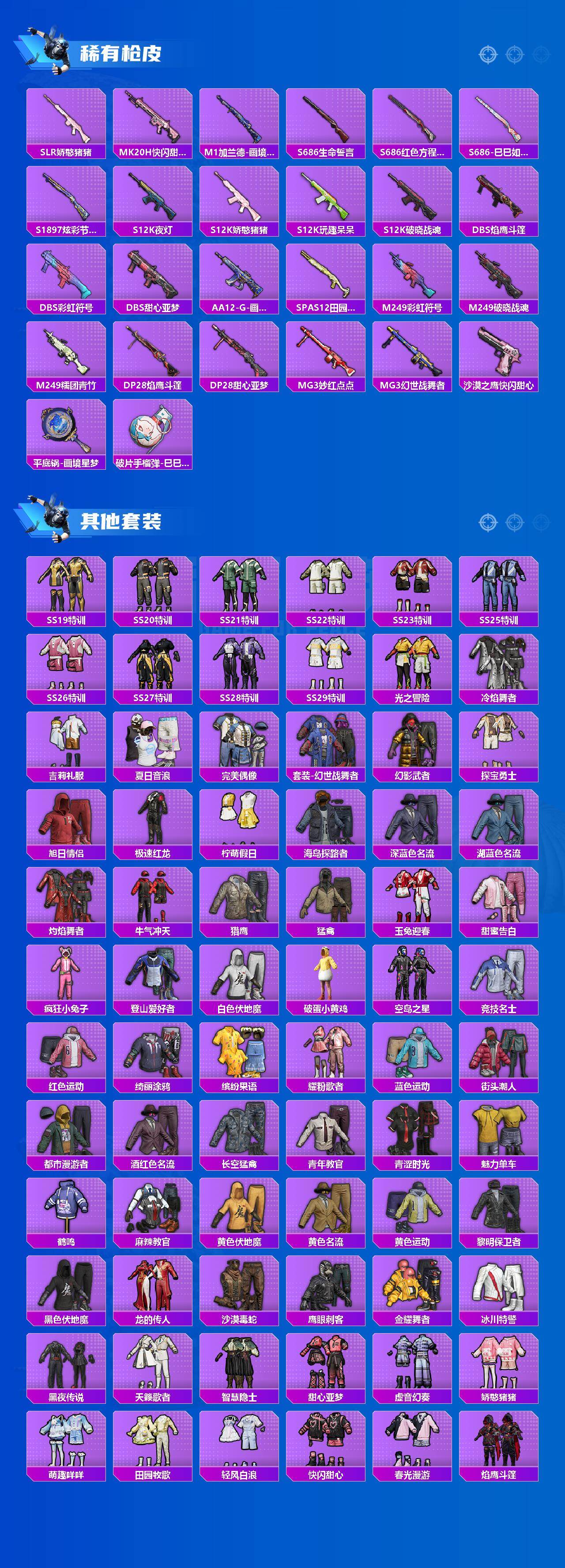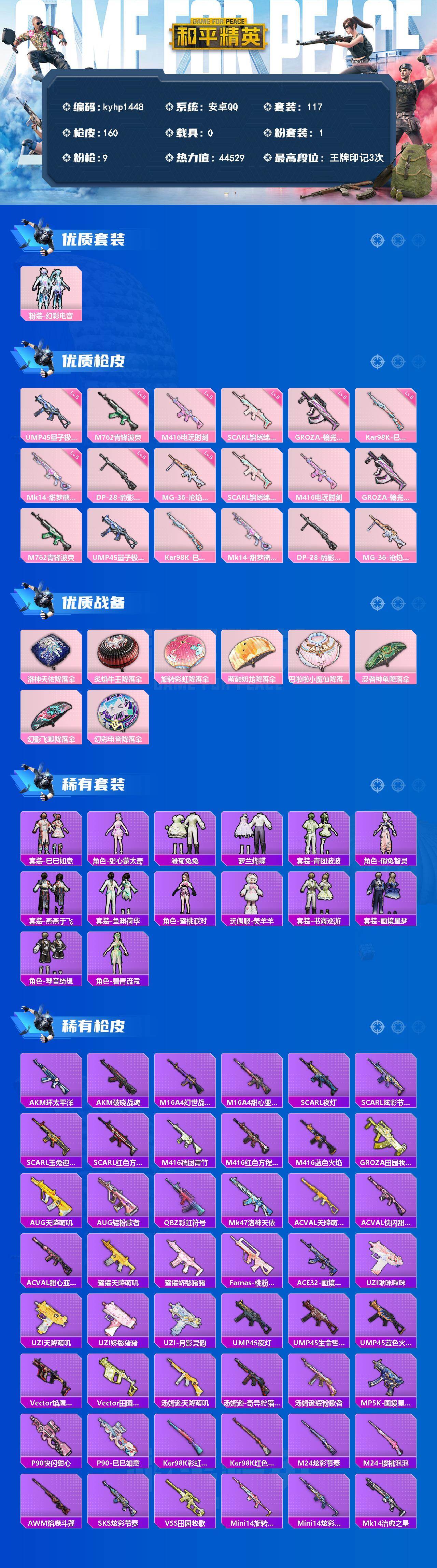 【账号佳】【和平精英】【编号:1499433】【可二次实名】安卓 手Q1粉装-9特效枪-0载具-0粉色飞行器-44529热力值-3王牌印记-117套装-160枪皮 【粉色套装】:粉装-幻彩电音 【粉色枪皮等级】:SCAR-L-锦绣绵绵(五级),M416-电玩时刻(五级),GROZA-镜光银凌(五级),M762-青锋波束(五级),UMP45-量子极限(五级),Kar98K-巳巳如意(五级),Mk14-甜梦熊击(五级),DP-28-豹影疾电(五级),MG-36-沧焰双生(五级) 【粉色枪皮】:SCAR-L-锦绣绵绵,M416-电玩时刻,GROZA-镜光银凌,M762-青锋波束,UMP45-量子极限,Kar98K-巳巳如意,Mk14-甜梦熊击,DP-28-豹影疾电,MG-36-沧焰双生 【粉色降落伞】:洛神天依降落伞,炙焰牛王降落伞,旋转彩虹降落伞,萌酷奶龙降落伞,巴啦啦小魔仙降落伞,忍者神龟降落伞,幻影飞狐降落伞,幻彩电音降落伞 【稀有套装】:套装-巳巳如意,角色-甜心蒙太奇,套装-雪国风尚,套装-雏菊兔兔,套装-萝兰蝴蝶,套装-青团波波,角色-俏兔智灵,套装-燕燕于飞,套装-鱼渊荷华,角色-蜜桃派对,玩偶服-美羊羊,套装-书海巡游,套装-画境星梦,套装-琴音绮想,角色-碧青流霞 【稀有枪皮】:AKM-环太平洋,AKM-破晓战魂,M16A4-幻世战舞者,M16A4-甜心亚梦,SCAR-L-夜灯,SCAR-L-炫彩节奏,SCAR-L-玉兔迎春,SCAR-L-红色方程式,M416-糯团青竹,M416-红色方程式,M416-蓝色火焰,GROZA-田园牧歌,AUG-天降萌叽,AUG-耀粉歌者,QBZ-彩虹符号,Mk47-洛神天依,AC-VAL-天降萌叽,AC-VAL-快闪甜心,AC-VAL-甜心亚梦,蜜獾-天降萌叽,蜜獾-娇憨猪猪,Famas-桃粉嫣然,ACE32-画境星梦,UZI-啾咪啾咪,UZI-天降萌叽,UZI-娇憨猪猪,UZI-月影灵韵,UMP45-夜灯,UMP45-生命誓言,UMP45-蓝色火焰,Vector-焰鹰斗篷,Vector-田园牧歌,汤姆逊-天降萌叽,汤姆逊-奇异狩猎者,汤姆逊-耀粉歌者,MP5K-画境星梦,P90-快闪甜心,P90-巳巳如意,Kar98K-彩虹符号,Kar98K-红色方程式,M24-炫彩节奏,M24-樱桃泡泡,AWM-焰鹰斗篷,SKS-炫彩节奏,VSS-田园牧歌,Mini14-旋转彩虹,Mini14-炫彩节奏,Mk14-治愈之星,SLR-娇憨猪猪,MK20-H-快闪甜心,M1加兰德-画境星梦,S686-生命誓言,S686-红色方程式,S686-巳巳如意,S1897-炫彩节奏,S12K-玩趣呆呆,S12K-破晓战魂,S12K-夜灯,S12K-娇憨猪猪,DBS-焰鹰斗篷,DBS-彩虹符号,DBS-甜心亚梦,AA12-G-画境星梦,SPAS-12-田园牧歌,M249-彩虹符号,M249-破晓战魂,M249-糯团青竹,DP-28-焰鹰斗篷,DP-28-甜心亚梦,MG3-妙红点点,MG3-幻世战舞者,沙漠之鹰-快闪甜心,平底锅-画境星梦,破片手榴弹-巳巳如意 【其他套装】:套装-SS19特训,套装-SS20特训,套装-SS21特训,套装-SS22特训,套装-SS23特训,套装-SS25特训,套装-SS26特训,套装-SS27特训,套装-SS28特训,套装-SS29特训,套装-光之冒险,套装-冷焰舞者,套装-吉莉礼服,套装-夏日音浪,套装-完美偶像,套装-幻世战舞者,套装-幻影武者,套装-探宝勇士,套装-旭日情侣,套装-极速红龙,套装-柠萌假日,套装-海岛探路者,套装-深蓝色名流,套装-湖蓝色名流,套装-灼焰舞者,套装-牛气冲天,套装-猎鹰,套装-猛禽,套装-玉兔迎春,套装-甜蜜告白,套装-疯狂小兔子,套装-登山爱好者,套装-白色伏地魔,套装-破蛋小黄鸡,套装-空岛之星,套装-竞技名士,套装-红色运动,套装-绮丽涂鸦,套装-缤纷果语,套装-耀粉歌者,套装-蓝色运动,套装-街头潮人,套装-都市漫游者,套装-酒红色名流,套装-长空猛禽,套装-青年教官,套装-青涩时光,套装-魅力单车,套装-鹤鸣,套装-麻辣教官,套装-黄色伏地魔,套装-黄色名流,套装-黄色运动,套装-黎明保卫者,套装-黑色伏地魔,套装-龙的传人,套装-沙漠毒蛇,套装-鹰眼刺客,套装-金耀舞者,套装-冰川特警,套装-黑夜传说,套装-天籁歌者,套装-智慧隐士,套装-甜心亚梦,套装-虚音幻奏,套装-娇憨猪猪,套装-萌趣咩咩,套装-田园牧歌,套装-轻风白浪,套装-快闪甜心,套装-春光漫游,套装-焰鹰斗篷,套装-幻羽潜行,角色-情公主,套装-纯真浪花,套装-热情海星 【营地ID】:905941732