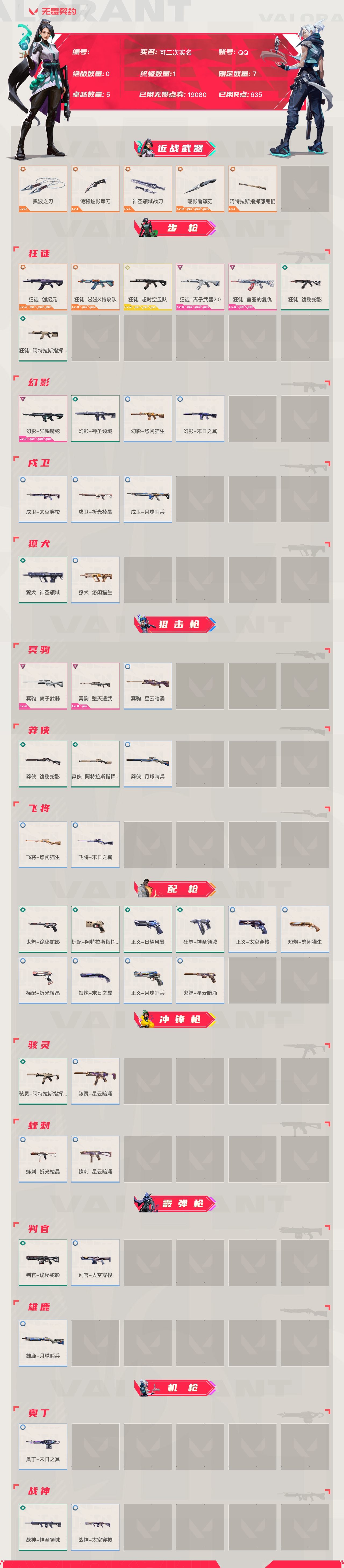 【账号佳】【无畏契约】【编号:39518】【6kswy2e2g】lv96|黄金iii, 刀皮数量5,呛皮数量44(绝版0限定7终极1卓越5);皮肤资产价值19080,已用r点635;【刀皮】:近战武器-黑波之刃,近战武器-诡秘蛇影军刀,近战武器-神圣领域战刀,近战武器-噬影者簇刃,近战武器-阿特拉斯指挥部甩棍; 【呛皮】:狂徒-创纪元,狂徒-滋滋x特攻队,狂徒-超时空卫队,狂徒-离子武器2.0,狂徒-盖亚的复仇,幻影-异鳞魔蛇,冥驹-离子武器,冥驹-堕天遗武,鬼魅-诡秘蛇影,判官-诡秘蛇影,狂徒-诡秘蛇影,莽侠-诡秘蛇影,狂徒-阿特拉斯指挥部,幻影-神圣领域,獠犬-神圣领域,莽侠-阿特拉斯指挥部,正义-日耀风暴,标配-阿特拉斯指挥部,狂怒-神圣领域,骇灵-阿特拉斯指挥部,战神-神圣领域,幻影-悠闲猫生,幻影-末日之翼,戍卫-太空穿梭,戍卫-折光棱晶,戍卫-月球哨兵,獠犬-悠闲猫生,冥驹-星云暗涌,莽侠-月球哨兵,飞将-悠闲猫生,飞将-末日之翼,正义-太空穿梭,正义-月球哨兵,鬼魅-星云暗涌,标配-折光棱晶,短炮-悠闲猫生,短炮-末日之翼,骇灵-星云暗涌,蜂刺-折光棱晶,蜂刺-星云暗涌,判官-太空穿梭,雄鹿-月球哨兵,奥丁-末日之翼,战神-太空穿梭;【热门卡面】:双城之战金克丝卡面,势不可挡星礈卡面;【热门挂饰】:双城之战魄罗挂饰,薰衣草之心挂饰,鱼骨头挂饰,神中神挂饰;【热门喷漆】:真烦人喷漆,买装还是存钱喷漆;详情看图【皮肤可能含有某些特权皮肤,具体以游戏内实际拥有为准】【qq】【可二次实名】【官方截图】