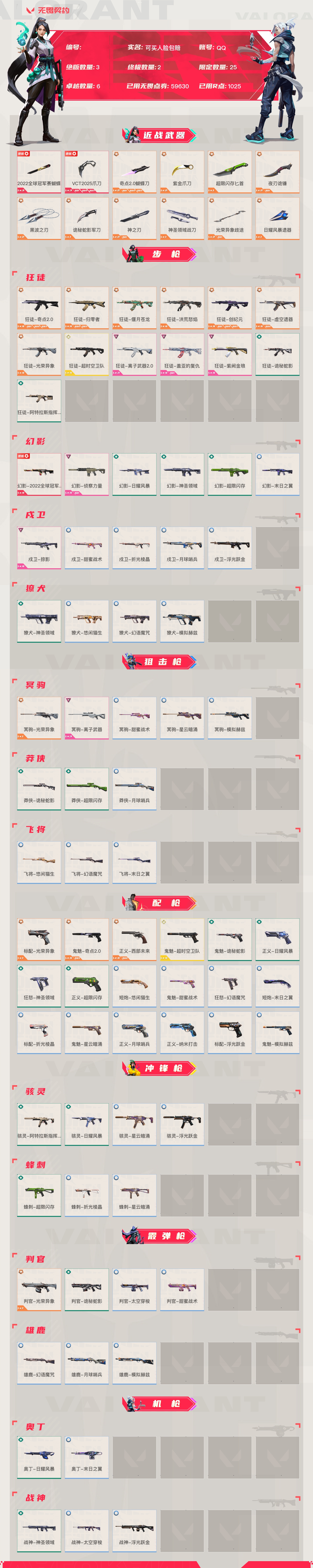 【账号佳】【无畏契约】【编号:39567】【6s5osgdfc】lv123|超凡ii, 刀皮数量12,呛皮数量76(绝版3限定25终极2卓越6);皮肤资产价值59630,已用r点1025;【刀皮】:近战武器-2022全球冠军赛蝴蝶刀,近战武器-vct2025爪刀,近战武器-奇点2.0蝴蝶刀,近战武器-紫金爪刀,近战武器-超限闪存匕首,近战武器-夜刃诡镰,近战武器-黑波之刃,近战武器-诡秘蛇影军刀,近战武器-神之刃,近战武器-神圣领域战刀,近战武器-光荣异象歧途,近战武器-日耀风暴遗器; 【呛皮】:幻影-2022全球冠军赛,标配-光荣异象,鬼魅-奇点2.0,正义-西部未来,判官-光荣异象,狂徒-奇点2.0,狂徒-归零者,狂徒-偃月苍龙,狂徒-洪荒怒焰,狂徒-创纪元,狂徒-虚空遗器,狂徒-光荣异象,冥驹-光荣异象,鬼魅-超时空卫队,狂徒-超时空卫队,狂徒-离子武器2.0,狂徒-盖亚的复仇,狂徒-紫阙金琅,幻影-侦察力量,戍卫-掠影,冥驹-离子武器,鬼魅-诡秘蛇影,判官-诡秘蛇影,狂徒-诡秘蛇影,莽侠-诡秘蛇影,狂徒-阿特拉斯指挥部,幻影-日耀风暴,幻影-神圣领域,幻影-超限闪存,獠犬-神圣领域,莽侠-超限闪存,正义-日耀风暴,正义-超限闪存,狂怒-神圣领域,骇灵-阿特拉斯指挥部,骇灵-日耀风暴,蜂刺-超限闪存,奥丁-日耀风暴,战神-神圣领域,幻影-末日之翼,戍卫-甜蜜战术,戍卫-折光棱晶,戍卫-月球哨兵,戍卫-浮光跃金,獠犬-悠闲猫生,獠犬-幻语魔咒,獠犬-模拟赫兹,冥驹-甜蜜战术,冥驹-星云暗涌,冥驹-模拟赫兹,莽侠-月球哨兵,飞将-悠闲猫生,飞将-幻语魔咒,飞将-末日之翼,正义-月球哨兵,正义-纳米打击,鬼魅-甜蜜战术,鬼魅-星云暗涌,鬼魅-模拟赫兹,标配-折光棱晶,标配-浮光跃金,短炮-悠闲猫生,短炮-末日之翼,狂怒-幻语魔咒,骇灵-星云暗涌,骇灵-浮光跃金,蜂刺-折光棱晶,蜂刺-星云暗涌,判官-太空穿梭,判官-甜蜜战术,雄鹿-幻语魔咒,雄鹿-月球哨兵,雄鹿-模拟赫兹,奥丁-末日之翼,战神-太空穿梭,战神-浮光跃金;【热门卡面】:势不可挡星礈卡面,vct2025cn联赛卡面,vct2025太平洋联赛卡面,vct2025美洲联赛卡面,vct2025emea联赛卡面,双城之战拥抱卡面,双城之战金克丝卡面;【热门挂饰】:幸运星挂饰,v25第三幕超凡挂饰,光荣异象挂饰,神中神挂饰,vct2025cn联赛挂饰,vct2025太平洋联赛挂饰,vct2025emea联赛挂饰,vct2025美洲联赛挂饰,双城之战小蛋糕挂饰,鱼骨头挂饰,终章ko小金人挂饰,奇点2.0挂饰;【热门喷漆】:2022全球冠军赛喷漆,捷风跳peek喷漆,买装还是存钱喷漆,真烦人喷漆,放下武器喷漆,皮蛋呼呼喷漆,小丑猫喷漆,奇点2.0喷漆,醒狮贺春喷漆;详情看图【皮肤可能含有某些特权皮肤,具体以游戏内实际拥有为准】【qq】【可买人脸包赔】【官方截图】