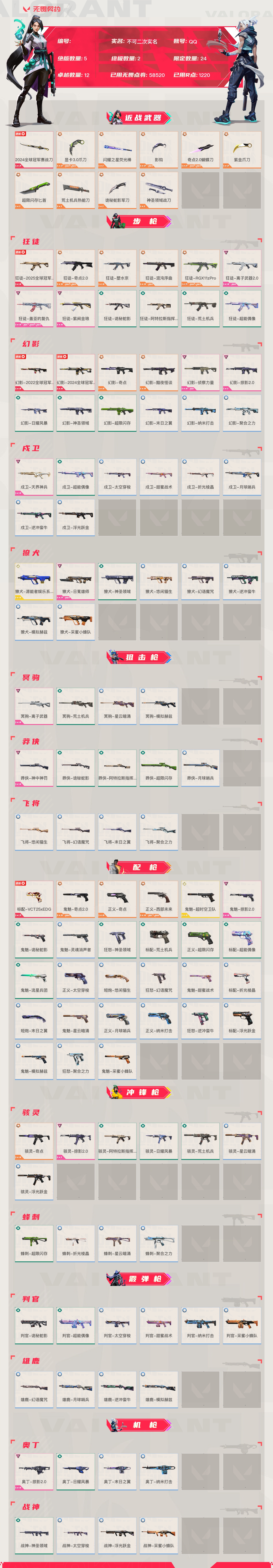 【账号佳】【无畏契约】【编号:39595】【6pr6mcagf】lv165|神话i, 刀皮数量10,呛皮数量109(绝版5限定24终极2卓越12);皮肤资产价值58520,已用r点1220;【刀皮】:近战武器-2024全球冠军赛战刀,近战武器-显卡3.0爪刀,近战武器-闪耀之星荧光棒,近战武器-影钩,近战武器-奇点2.0蝴蝶刀,近战武器-紫金爪刀,近战武器-超限闪存匕首,近战武器-荒土机兵热能刀,近战武器-诡秘蛇影军刀,近战武器-神圣领域战刀; 【呛皮】:标配-vct25xedg,狂徒-2025全球冠军赛,幻影-2022全球冠军赛,幻影-2024全球冠军赛,鬼魅-奇点2.0,正义-奇点,正义-西部未来,骇灵-奇点,狂徒-奇点2.0,狂徒-塑水宗,狂徒-混沌序曲,狂徒-rgx11zpro,幻影-奇点,幻影-黯夜怪谈,鬼魅-超时空卫队,獠犬-源能者娱乐系统,鬼魅-掠影2.0,骇灵-掠影2.0,狂徒-离子武器2.0,狂徒-盖亚的复仇,狂徒-紫阙金琅,幻影-侦察力量,幻影-掠影2.0,戍卫-天界神兵,獠犬-日冕雄师,冥驹-离子武器,莽侠-神中神罚,奥丁-掠影2.0,鬼魅-诡秘蛇影,判官-诡秘蛇影,狂徒-诡秘蛇影,莽侠-诡秘蛇影,鬼魅-灵魂消声者,狂徒-阿特拉斯指挥部,狂徒-荒土机兵,狂徒-超能偶像,幻影-日耀风暴,幻影-神圣领域,幻影-超限闪存,戍卫-超能偶像,獠犬-神圣领域,冥驹-荒土机兵,莽侠-阿特拉斯指挥部,莽侠-超限闪存,正义-超限闪存,鬼魅-流星兵团,标配-荒土机兵,标配-超能偶像,狂怒-神圣领域,骇灵-阿特拉斯指挥部,骇灵-日耀风暴,骇灵-荒土机兵,蜂刺-超限闪存,判官-超能偶像,奥丁-日耀风暴,战神-神圣领域,幻影-末日之翼,幻影-纳米打击,幻影-聚合之力,戍卫-太空穿梭,戍卫-甜蜜战术,戍卫-折光棱晶,戍卫-月球哨兵,戍卫-逆冲蛮牛,戍卫-浮光跃金,獠犬-悠闲猫生,獠犬-幻语魔咒,獠犬-逆冲蛮牛,獠犬-模拟赫兹,獠犬-采蜜小蜂队,冥驹-星云暗涌,冥驹-模拟赫兹,莽侠-月球哨兵,飞将-悠闲猫生,飞将-幻语魔咒,飞将-末日之翼,飞将-聚合之力,正义-太空穿梭,正义-月球哨兵,正义-纳米打击,鬼魅-甜蜜战术,鬼魅-星云暗涌,鬼魅-模拟赫兹,鬼魅-采蜜小蜂队,标配-折光棱晶,标配-浮光跃金,短炮-悠闲猫生,短炮-末日之翼,狂怒-幻语魔咒,狂怒-逆冲蛮牛,狂怒-聚合之力,骇灵-星云暗涌,骇灵-浮光跃金,蜂刺-折光棱晶,蜂刺-星云暗涌,蜂刺-聚合之力,判官-太空穿梭,判官-甜蜜战术,判官-纳米打击,判官-采蜜小蜂队,雄鹿-幻语魔咒,雄鹿-月球哨兵,雄鹿-逆冲蛮牛,雄鹿-模拟赫兹,奥丁-末日之翼,奥丁-纳米打击,战神-太空穿梭,战神-浮光跃金,战神-采蜜小蜂队;【热门卡面】:清风徐来卡面,噬影者卡面,势不可挡星礈卡面,vct25xedg卡面,分崩离析卡面,超能偶像卡面,2024全球冠军赛卡面,势不可挡不死鸟卡面;【热门挂饰】:v25第三幕神话挂饰,双城之战魄罗挂饰,神中神挂饰,vctxedg挂饰,终章ko小金人挂饰,奇点2.0挂饰,超能偶像挂饰,2024全球冠军赛挂饰,袖珍捷风挂饰,糖葫芦挂饰,传世莲华挂饰;【热门喷漆】:飞吧不死鸟喷漆,真烦人喷漆,vctxedg喷漆,鼻尖上的蝴蝶喷漆,皮蛋呼呼喷漆,奇点2.0喷漆,小丑猫喷漆,撸到秃喷漆,超能偶像喷漆,2024全球冠军赛喷漆,复活我捷风喷漆,买装还是存钱喷漆,双击点赞喷漆,醒狮贺春喷漆;详情看图【皮肤可能含有某些特权皮肤,具体以游戏内实际拥有为准】【qq】【不可二次实名】【官方截图】