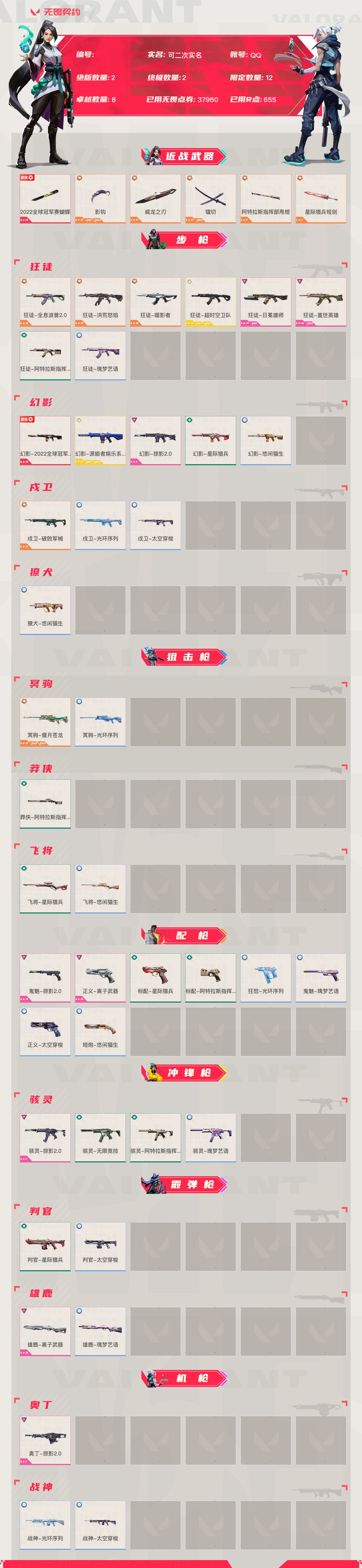 【账号佳】【无畏契约】【编号:39739】【6tnj3h121】lv90|钻石i, 刀皮数量6,呛皮数量41(绝版2限定12终极2卓越8);皮肤资产价值37960,已用r点655;【刀皮】:近战武器-2022全球冠军赛蝴蝶刀,近战武器-影钩,近战武器-威龙之刃,近战武器-镭切,近战武器-阿特拉斯指挥部甩棍,近战武器-星际猎兵短剑; 【呛皮】:幻影-2022全球冠军赛,狂徒-全息波普2.0,狂徒-洪荒怒焰,狂徒-噬影者,戍卫-破败军械,冥驹-偃月苍龙,狂徒-超时空卫队,幻影-源能者娱乐系统,鬼魅-掠影2.0,正义-离子武器,骇灵-掠影2.0,雄鹿-离子武器,狂徒-日冕雄师,狂徒-盖世英雄,幻影-掠影2.0,奥丁-掠影2.0,标配-星际猎兵,骇灵-无限竞技,判官-星际猎兵,幻影-星际猎兵,飞将-星际猎兵,狂徒-阿特拉斯指挥部,莽侠-阿特拉斯指挥部,标配-阿特拉斯指挥部,骇灵-阿特拉斯指挥部,狂徒-瑰梦艺语,幻影-悠闲猫生,戍卫-光环序列,戍卫-太空穿梭,獠犬-悠闲猫生,冥驹-光环序列,飞将-悠闲猫生,正义-太空穿梭,鬼魅-瑰梦艺语,短炮-悠闲猫生,狂怒-光环序列,骇灵-瑰梦艺语,判官-太空穿梭,雄鹿-瑰梦艺语,战神-光环序列,战神-太空穿梭;【热门卡面】:势不可挡贤者卡面,势不可挡蝰蛇卡面,势不可挡捷风卡面;【热门挂饰】:蓄势待滚挂饰,鱼骨头挂饰,薰衣草之心挂饰,神中神挂饰;【热门喷漆】:小丑猫喷漆,梦中惊坐起思考阵容喷漆,买装还是存钱喷漆,让我进去喷漆,2022全球冠军赛喷漆;详情看图【皮肤可能含有某些特权皮肤,具体以游戏内实际拥有为准】【qq】【可二次实名】【官方截图】