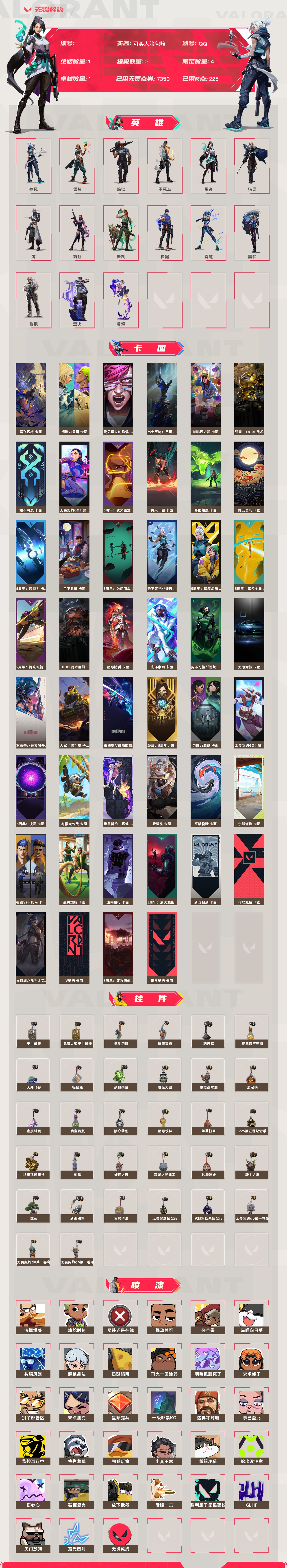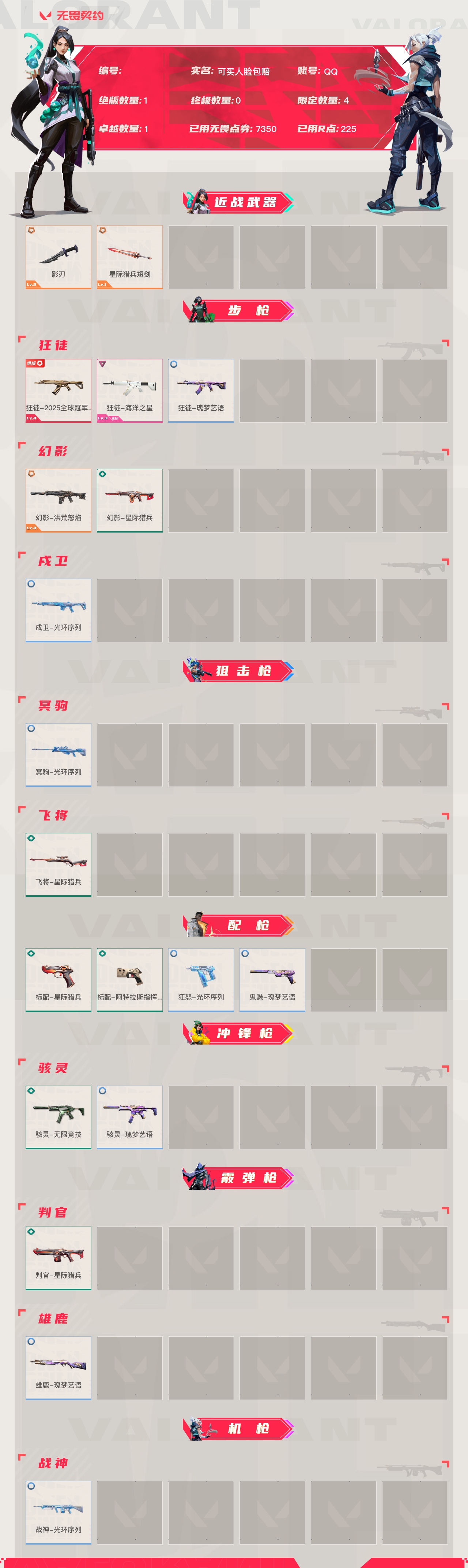 【账号佳】【无畏契约】【编号:39741】【6tnj32a1a】lv55|白银i, 刀皮数量2,呛皮数量17(绝版1限定4终极0卓越1);皮肤资产价值7350,已用r点225;【刀皮】:近战武器-影刃,近战武器-星际猎兵短剑; 【呛皮】:狂徒-2025全球冠军赛,幻影-洪荒怒焰,狂徒-海洋之星,标配-星际猎兵,骇灵-无限竞技,判官-星际猎兵,幻影-星际猎兵,飞将-星际猎兵,标配-阿特拉斯指挥部,狂徒-瑰梦艺语,戍卫-光环序列,冥驹-光环序列,鬼魅-瑰梦艺语,狂怒-光环序列,骇灵-瑰梦艺语,雄鹿-瑰梦艺语,战神-光环序列;【热门卡面】:势不可挡捷风卡面,势不可挡蝰蛇卡面,逆向独行卡面,双城之战金克丝卡面;【热门挂饰】:金属蝶翼挂饰,双城之战魄罗挂饰,蓄势待滚挂饰;【热门喷漆】:买装还是存钱喷漆,来点朋克喷漆,纸箱小猫喷漆,放下武器喷漆;详情看图【皮肤可能含有某些特权皮肤,具体以游戏内实际拥有为准】【qq】【可买人脸包赔】【官方截图】