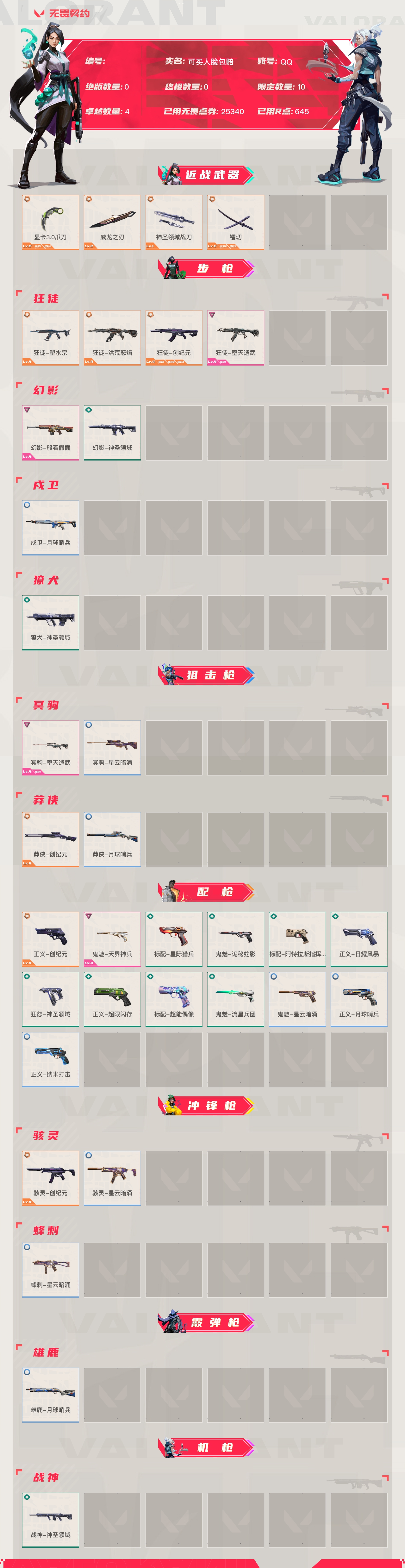 【账号佳】【无畏契约】【编号:39755】【6tnj3afah】lv231|钻石i, 刀皮数量4,呛皮数量30(绝版0限定10终极0卓越4);皮肤资产价值25340,已用r点645;【刀皮】:近战武器-显卡3.0爪刀,近战武器-威龙之刃,近战武器-神圣领域战刀,近战武器-镭切; 【呛皮】:正义-创纪元,骇灵-创纪元,狂徒-塑水宗,狂徒-洪荒怒焰,狂徒-创纪元,莽侠-创纪元,鬼魅-天界神兵,狂徒-堕天遗武,幻影-般若假面,冥驹-堕天遗武,标配-星际猎兵,鬼魅-诡秘蛇影,幻影-神圣领域,獠犬-神圣领域,正义-日耀风暴,正义-超限闪存,鬼魅-流星兵团,标配-阿特拉斯指挥部,标配-超能偶像,狂怒-神圣领域,战神-神圣领域,戍卫-月球哨兵,冥驹-星云暗涌,莽侠-月球哨兵,正义-月球哨兵,正义-纳米打击,鬼魅-星云暗涌,骇灵-星云暗涌,蜂刺-星云暗涌,雄鹿-月球哨兵;【热门卡面】:势不可挡星礈卡面,势不可挡零卡面,势不可挡盖可卡面,情人节捷风卡面,双城之战拥抱卡面;【热门挂饰】:神中神挂饰,创纪元挂饰,金属蝶翼挂饰,永生玫瑰挂饰,永结同心挂饰,双城之战小蛋糕挂饰,终章ko小金人挂饰,袖珍捷风挂饰,糖葫芦挂饰,双城之战魄罗挂饰;【热门喷漆】:来点朋克喷漆,真烦人喷漆,小丑猫喷漆,买装还是存钱喷漆,双击点赞喷漆;详情看图【皮肤可能含有某些特权皮肤,具体以游戏内实际拥有为准】【qq】【可买人脸包赔】【官方截图】