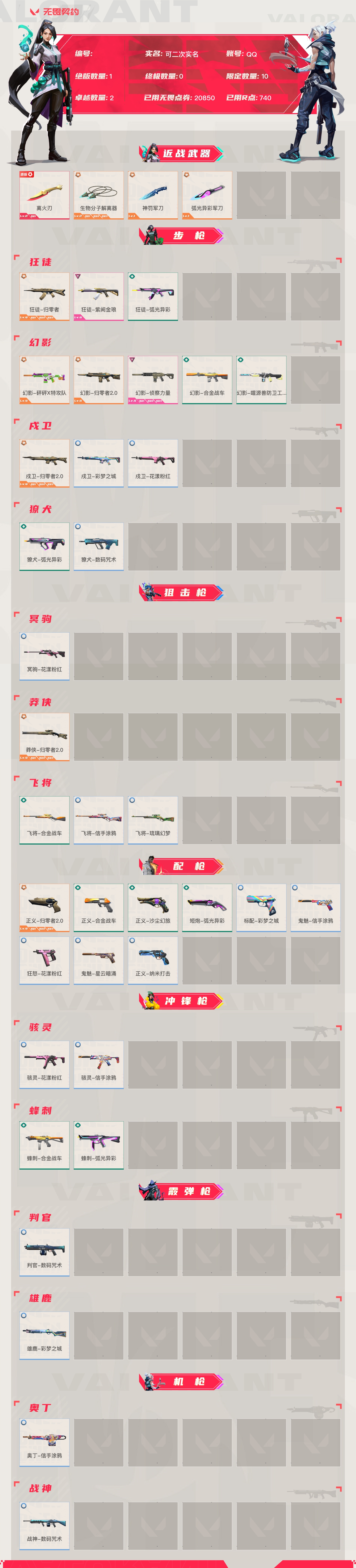 【账号佳】【无畏契约】【编号:39761】【6tnj3e1fg】lv141|钻石ii, 刀皮数量4,呛皮数量35(绝版1限定10终极0卓越2);皮肤资产价值20850,已用r点740;【刀皮】:近战武器-离火刃,近战武器-生物分子解离器,近战武器-神罚军刀,近战武器-弧光异彩军刀; 【呛皮】:正义-归零者2.0,狂徒-归零者,幻影-砰砰x特攻队,幻影-归零者2.0,戍卫-归零者2.0,莽侠-归零者2.0,狂徒-紫阙金琅,幻影-侦察力量,正义-合金战车,正义-沙尘幻旅,短炮-弧光异彩,蜂刺-合金战车,蜂刺-弧光异彩,狂徒-弧光异彩,幻影-合金战车,幻影-噬源兽防卫工程,獠犬-弧光异彩,飞将-合金战车,标配-彩梦之城,鬼魅-信手涂鸦,狂怒-花漾粉红,骇灵-花漾粉红,骇灵-信手涂鸦,判官-数码咒术,雄鹿-彩梦之城,戍卫-彩梦之城,戍卫-花漾粉红,獠犬-数码咒术,冥驹-花漾粉红,飞将-信手涂鸦,奥丁-信手涂鸦,战神-数码咒术,飞将-琉璃幻梦,正义-纳米打击,鬼魅-星云暗涌;【热门卡面】:许愿星砂卡面,虹吸式咖啡壶卡面,双城之战拥抱卡面,势不可挡零卡面,离火刃凰卡面,离火刃凤卡面;【热门挂饰】:v25第三幕超凡挂饰,神中神挂饰,第九季超凡挂饰,飞刀挂饰,袖珍捷风挂饰,第八季超凡挂饰,传世莲华挂饰,冬日絮语挂饰,幸运中国结挂饰,数码咒术挂饰;【热门喷漆】:九命灵猫喷漆,捷风喷漆,双击点赞喷漆,买装还是存钱喷漆,随机武器喷漆,醒狮贺春喷漆,口袋贤者喷漆,想都别想喷漆,继续摇滚喷漆,撸到秃喷漆,看穿一切喷漆,目瞪口呆喷漆,盖可差距喷漆,纸箱小猫喷漆,自我否定喷漆,没有资金喷漆;详情看图【皮肤可能含有某些特权皮肤,具体以游戏内实际拥有为准】【qq】【可二次实名】【官方截图】