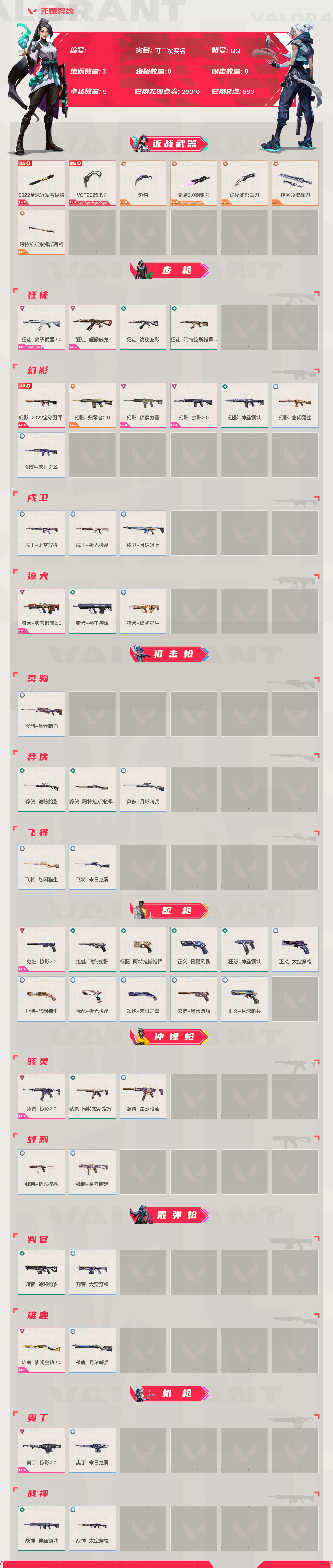 【账号佳】【无畏契约】【编号:39771】【6r9wqddha】lv69|白银ii, 刀皮数量7,呛皮数量47(绝版3限定9终极0卓越9);皮肤资产价值29010,已用r点660;【刀皮】:近战武器-2022全球冠军赛蝴蝶刀,近战武器-vct2025爪刀,近战武器-影钩,近战武器-奇点2.0蝴蝶刀,近战武器-诡秘蛇影军刀,近战武器-神圣领域战刀,近战武器-阿特拉斯指挥部甩棍; 【呛皮】:幻影-2022全球冠军赛,幻影-归零者2.0,鬼魅-掠影2.0,骇灵-掠影2.0,雄鹿-紫阙金琅2.0,狂徒-离子武器2.0,狂徒-耀鳞威龙,幻影-侦察力量,幻影-掠影2.0,獠犬-般若假面2.0,奥丁-掠影2.0,鬼魅-诡秘蛇影,判官-诡秘蛇影,狂徒-诡秘蛇影,莽侠-诡秘蛇影,狂徒-阿特拉斯指挥部,幻影-神圣领域,獠犬-神圣领域,莽侠-阿特拉斯指挥部,正义-日耀风暴,标配-阿特拉斯指挥部,狂怒-神圣领域,骇灵-阿特拉斯指挥部,战神-神圣领域,幻影-悠闲猫生,幻影-末日之翼,戍卫-太空穿梭,戍卫-折光棱晶,戍卫-月球哨兵,獠犬-悠闲猫生,冥驹-星云暗涌,莽侠-月球哨兵,飞将-悠闲猫生,飞将-末日之翼,正义-太空穿梭,正义-月球哨兵,鬼魅-星云暗涌,标配-折光棱晶,短炮-悠闲猫生,短炮-末日之翼,骇灵-星云暗涌,蜂刺-折光棱晶,蜂刺-星云暗涌,判官-太空穿梭,雄鹿-月球哨兵,奥丁-末日之翼,战神-太空穿梭;【热门卡面】:情人节捷风卡面,星宿灿烂猎枭卡面,势不可挡星礈卡面,vct2025cn联赛卡面,vct2025太平洋联赛卡面,vct2025美洲联赛卡面,vct2025emea联赛卡面;【热门挂饰】:神中神挂饰,vct2025cn联赛挂饰,vct2025太平洋联赛挂饰,vct2025emea联赛挂饰,vct2025美洲联赛挂饰;【热门喷漆】:这就太不行了喷漆,2022全球冠军赛喷漆,买装还是存钱喷漆,真烦人喷漆;详情看图【皮肤可能含有某些特权皮肤,具体以游戏内实际拥有为准】【qq】【可二次实名】【官方截图】