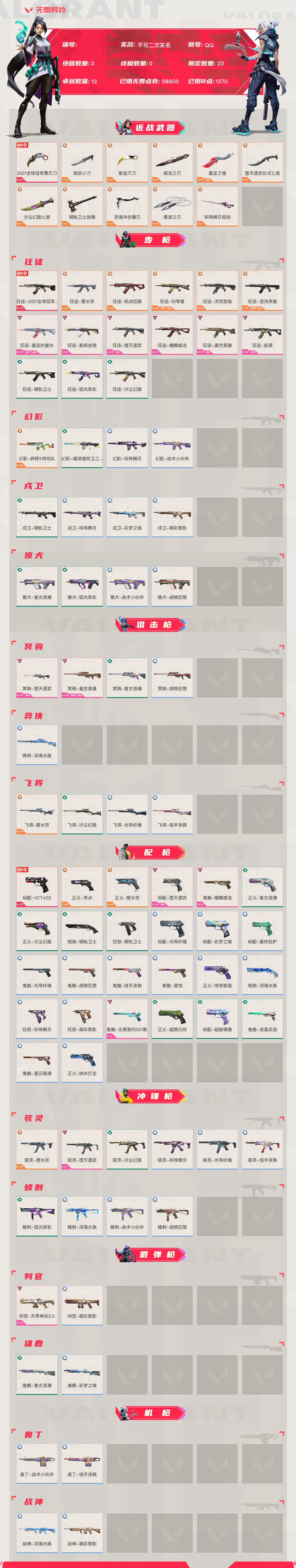 【账号佳】【无畏契约】【编号:39794】【6ztq6fgbf】lv239|未定级, 刀皮数量11,呛皮数量80(绝版3限定23终极0卓越13);皮肤资产价值58600,已用r点1370;【刀皮】:近战武器-2021全球冠军赛爪刀,近战武器-剥皮小刀,近战武器-紫金爪刀,近战武器-威龙之刃,近战武器-盖亚之愠,近战武器-堕天遗武仪式匕首,近战武器-沙尘幻旅匕首,近战武器-钢轨卫士战锤,近战武器-灵魂冲击镰刃,近战武器-黑波之刃,近战武器-珍珠棘贝短剑; 【呛皮】:标配-vctxg2,狂徒-2021全球冠军赛,正义-奇点,正义-塑水宗,骇灵-塑水宗,狂徒-塑水宗,狂徒-机动狂飙,狂徒-归零者,狂徒-洪荒怒焰,狂徒-混沌序曲,幻影-砰砰x特攻队,飞将-塑水宗,标配-堕天遗武,鬼魅-耀鳞威龙,骇灵-堕天遗武,判官-天界神兵2.0,狂徒-盖亚的复仇,狂徒-紫阙金琅,狂徒-堕天遗武,狂徒-耀鳞威龙,狂徒-盖世英雄,狂徒-起源,冥驹-堕天遗武,冥驹-盖世英雄,正义-复古浪潮,正义-沙尘幻旅,短炮-钢轨卫士,狂怒-钢轨卫士,骇灵-沙尘幻旅,蜂刺-弧光异彩,雄鹿-复古浪潮,狂徒-钢轨卫士,狂徒-弧光异彩,狂徒-沙尘幻旅,幻影-噬源兽防卫工程,戍卫-钢轨卫士,獠犬-复古浪潮,獠犬-弧光异彩,冥驹-复古浪潮,飞将-沙尘幻旅,标配-光导纤维,标配-彩梦之城,标配-最终庇护,鬼魅-光导纤维,鬼魅-胡桃狂想,鬼魅-信手涂鸦,鬼魅-星蚀,正义-传奇制造,短炮-深海水族,狂怒-珍珠棘贝,狂怒-萌彩剪影,骇灵-珍珠棘贝,骇灵-光导纤维,骇灵-信手涂鸦,蜂刺-深海水族,蜂刺-战术小伙伴,蜂刺-胡桃狂想,判官-萌彩剪影,雄鹿-彩梦之城,幻影-珍珠棘贝,幻影-战术小伙伴,戍卫-珍珠棘贝,戍卫-彩梦之城,戍卫-萌彩剪影,獠犬-战术小伙伴,獠犬-胡桃狂想,冥驹-胡桃狂想,飞将-光导纤维,飞将-信手涂鸦,莽侠-深海水族,奥丁-战术小伙伴,奥丁-信手涂鸦,战神-深海水族,战神-萌彩剪影,鬼魅-无畏契约go第一卷,正义-超限闪存,鬼魅-流星兵团,标配-超能偶像,正义-纳米打击,鬼魅-星云暗涌;【热门卡面】:双城之战拥抱卡面,星宿灿烂猎枭卡面,万圣夜卡面,虹吸式咖啡壶卡面,命运之手审判卡面,vctxg2卡面,今天双排小右卡面,今天双排小左卡面,今天双排游戏之夜卡面,耀鳞威龙卡面,双城之战金克丝卡面,塑水宗卡面,势不可挡盖可卡面,逆向独行卡面,势不可挡ko卡面;【热门挂饰】:双城之战小蛋糕挂饰,终章ko小金人挂饰,袖珍捷风挂饰,糖葫芦挂饰,第八季神话挂饰,传世莲华挂饰,vctxg2挂饰,耀鳞威龙挂饰,鱼骨头挂饰,双城之战魄罗挂饰,金角生辉挂饰,塑水宗挂饰,第七季超凡挂饰,针织蜜蜂挂饰,高音谱号挂饰,冬日絮语挂饰,幸运中国结挂饰;【热门喷漆】:纸箱小猫喷漆,小丑猫喷漆,买装还是存钱喷漆,情绪控制喷漆,双人比心喷漆,双击点赞喷漆,vctxg2喷漆,耀鳞威龙喷漆,醒狮贺春喷漆,飓刃涂鸦喷漆,塑水宗喷漆,战术小伙伴喷漆,一切安好喷漆,这招不行了喷漆,红牌退场喷漆,口袋贤者喷漆,继续摇滚喷漆,撸到秃喷漆,看穿一切喷漆;详情看图【皮肤可能含有某些特权皮肤,具体以游戏内实际拥有为准】【qq】【不可二次实名】【官方截图】
