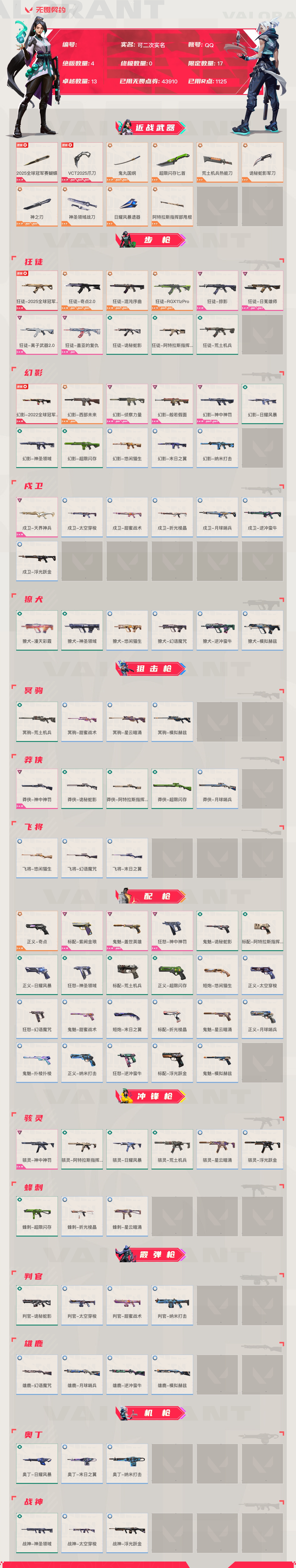 【账号佳】【无畏契约】【编号:39798】【6ztq6ee21】lv152|未定级, 刀皮数量10,呛皮数量93(绝版4限定17终极0卓越13);皮肤资产价值43910,已用r点1125;【刀皮】:近战武器-2025全球冠军赛蝴蝶刀,近战武器-vct2025爪刀,近战武器-鬼丸国纲,近战武器-超限闪存匕首,近战武器-荒土机兵热能刀,近战武器-诡秘蛇影军刀,近战武器-神之刃,近战武器-神圣领域战刀,近战武器-日耀风暴遗器,近战武器-阿特拉斯指挥部甩棍; 【呛皮】:狂徒-2025全球冠军赛,幻影-2022全球冠军赛,正义-奇点,狂徒-奇点2.0,狂徒-混沌序曲,狂徒-rgx11zpro,幻影-西部未来,标配-紫阙金琅,鬼魅-盖世英雄,狂怒-神中神罚,骇灵-神中神罚,狂徒-掠影,狂徒-日冕雄师,狂徒-离子武器2.0,狂徒-盖亚的复仇,幻影-侦察力量,幻影-般若假面,幻影-神中神罚,戍卫-天界神兵,莽侠-神中神罚,鬼魅-诡秘蛇影,判官-诡秘蛇影,狂徒-诡秘蛇影,獠犬-漫天彩霞,莽侠-诡秘蛇影,狂徒-阿特拉斯指挥部,狂徒-荒土机兵,幻影-日耀风暴,幻影-神圣领域,幻影-超限闪存,獠犬-神圣领域,冥驹-荒土机兵,莽侠-阿特拉斯指挥部,莽侠-超限闪存,正义-日耀风暴,正义-超限闪存,标配-阿特拉斯指挥部,标配-荒土机兵,狂怒-神圣领域,骇灵-阿特拉斯指挥部,骇灵-日耀风暴,骇灵-荒土机兵,蜂刺-超限闪存,奥丁-日耀风暴,战神-神圣领域,幻影-悠闲猫生,幻影-末日之翼,幻影-纳米打击,戍卫-太空穿梭,戍卫-甜蜜战术,戍卫-折光棱晶,戍卫-月球哨兵,戍卫-逆冲蛮牛,戍卫-浮光跃金,獠犬-悠闲猫生,獠犬-幻语魔咒,獠犬-逆冲蛮牛,獠犬-模拟赫兹,冥驹-甜蜜战术,冥驹-星云暗涌,冥驹-模拟赫兹,莽侠-月球哨兵,飞将-悠闲猫生,飞将-幻语魔咒,飞将-末日之翼,正义-太空穿梭,正义-月球哨兵,正义-纳米打击,鬼魅-甜蜜战术,鬼魅-星云暗涌,鬼魅-扑棱扑棱,鬼魅-模拟赫兹,标配-折光棱晶,标配-浮光跃金,短炮-悠闲猫生,短炮-末日之翼,狂怒-幻语魔咒,狂怒-逆冲蛮牛,骇灵-星云暗涌,骇灵-浮光跃金,蜂刺-折光棱晶,蜂刺-星云暗涌,判官-太空穿梭,判官-甜蜜战术,判官-纳米打击,雄鹿-幻语魔咒,雄鹿-月球哨兵,雄鹿-逆冲蛮牛,雄鹿-模拟赫兹,奥丁-末日之翼,奥丁-纳米打击,战神-太空穿梭,战神-浮光跃金;【热门卡面】:势不可挡芮娜卡面,势不可挡ko卡面,情人节猎枭卡面,势不可挡贤者卡面,势不可挡捷风卡面,vct2025cn联赛卡面,vct2025太平洋联赛卡面,vct2025美洲联赛卡面,vct2025emea联赛卡面,势不可挡星礈卡面,双城之战金克丝卡面,分崩离析卡面,双城之战拥抱卡面;【热门挂饰】:鱼骨头挂饰,双城之战魄罗挂饰,神中神罚挂饰,神中神挂饰,vct2025cn联赛挂饰,vct2025太平洋联赛挂饰,vct2025emea联赛挂饰,vct2025美洲联赛挂饰,金属蝶翼挂饰,双城之战小蛋糕挂饰,终章ko小金人挂饰;【热门喷漆】:捷风跳peek喷漆,超能偶像喷漆,一切安好喷漆,真烦人喷漆,鼻尖上的蝴蝶喷漆,来点朋克喷漆,撸到秃喷漆,买装还是存钱喷漆,蹦蹦小兔喷漆,皮蛋呼呼喷漆,小丑猫喷漆;详情看图【皮肤可能含有某些特权皮肤,具体以游戏内实际拥有为准】【qq】【可二次实名】【官方截图】