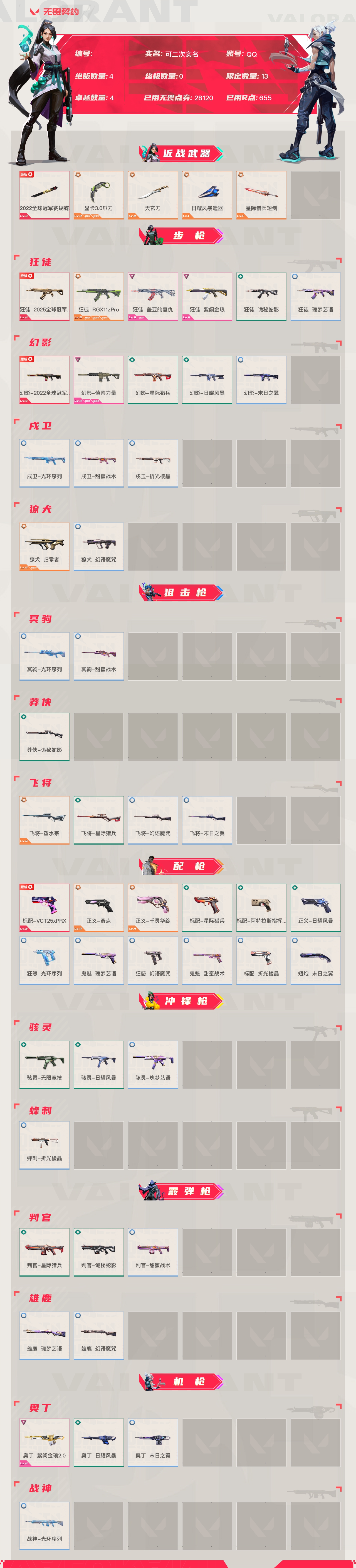 【账号佳】【无畏契约】【编号:39804】【643741g12】lv67|未定级, 刀皮数量5,呛皮数量48(绝版4限定13终极0卓越4);皮肤资产价值28120,已用r点655;【刀皮】:近战武器-2022全球冠军赛蝴蝶刀,近战武器-显卡3.0爪刀,近战武器-天玄刀,近战武器-日耀风暴遗器,近战武器-星际猎兵短剑; 【呛皮】:标配-vct25xprx,狂徒-2025全球冠军赛,幻影-2022全球冠军赛,正义-奇点,正义-千灵华绽,狂徒-rgx11zpro,獠犬-归零者,飞将-塑水宗,狂徒-盖亚的复仇,狂徒-紫阙金琅,幻影-侦察力量,奥丁-紫阙金琅2.0,标配-星际猎兵,骇灵-无限竞技,判官-星际猎兵,判官-诡秘蛇影,狂徒-诡秘蛇影,幻影-星际猎兵,飞将-星际猎兵,莽侠-诡秘蛇影,幻影-日耀风暴,正义-日耀风暴,标配-阿特拉斯指挥部,骇灵-日耀风暴,奥丁-日耀风暴,狂徒-瑰梦艺语,幻影-末日之翼,戍卫-光环序列,戍卫-甜蜜战术,戍卫-折光棱晶,獠犬-幻语魔咒,冥驹-光环序列,冥驹-甜蜜战术,飞将-幻语魔咒,飞将-末日之翼,鬼魅-瑰梦艺语,鬼魅-甜蜜战术,标配-折光棱晶,短炮-末日之翼,狂怒-光环序列,狂怒-幻语魔咒,骇灵-瑰梦艺语,蜂刺-折光棱晶,判官-甜蜜战术,雄鹿-瑰梦艺语,雄鹿-幻语魔咒,奥丁-末日之翼,战神-光环序列;【热门卡面】:vct25xprx卡面,势不可挡蝰蛇卡面,势不可挡贤者卡面,势不可挡捷风卡面,双城之战金克丝卡面;【热门挂饰】:vctxprx挂饰,frgmtx皮蛋挂饰,金属蝶翼挂饰,薰衣草之心挂饰,神中神挂饰;【热门喷漆】:vctxprx喷漆,来点朋克喷漆,秘笈顺序喷漆,捷风跳peek喷漆,2022全球冠军赛喷漆,买装还是存钱喷漆,放下武器喷漆;详情看图【皮肤可能含有某些特权皮肤,具体以游戏内实际拥有为准】【qq】【可二次实名】【官方截图】