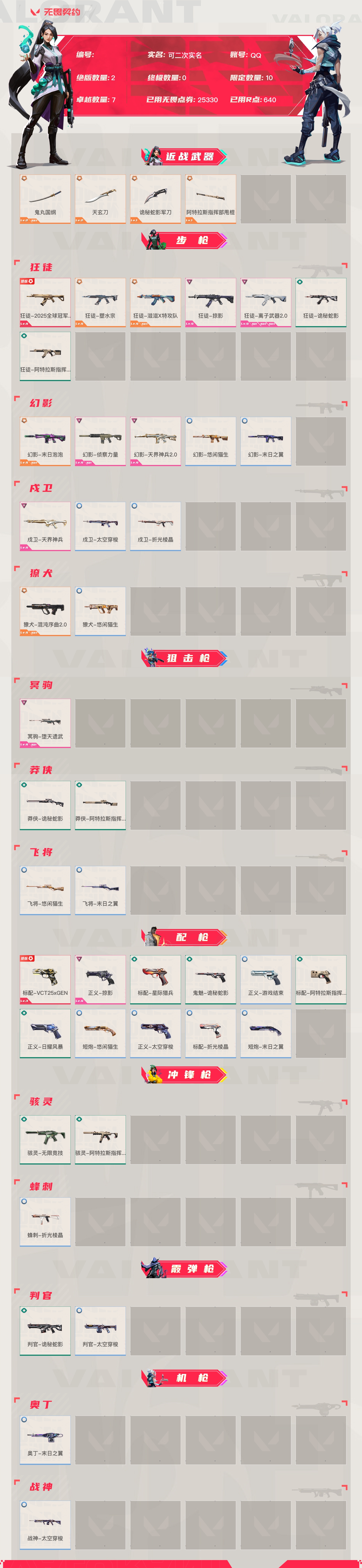 【账号佳】【无畏契约】【编号:39805】【64374egfe】lv160|未定级, 刀皮数量4,呛皮数量40(绝版2限定10终极0卓越7);皮肤资产价值25330,已用r点640;【刀皮】:近战武器-鬼丸国纲,近战武器-天玄刀,近战武器-诡秘蛇影军刀,近战武器-阿特拉斯指挥部甩棍; 【呛皮】:标配-vct25xgen,狂徒-2025全球冠军赛,狂徒-塑水宗,狂徒-滋滋x特攻队,幻影-末日泡泡,獠犬-混沌序曲2.0,正义-掠影,狂徒-掠影,狂徒-离子武器2.0,幻影-侦察力量,幻影-天界神兵2.0,戍卫-天界神兵,冥驹-堕天遗武,标配-星际猎兵,鬼魅-诡秘蛇影,骇灵-无限竞技,判官-诡秘蛇影,狂徒-诡秘蛇影,莽侠-诡秘蛇影,正义-游戏结束,狂徒-阿特拉斯指挥部,莽侠-阿特拉斯指挥部,正义-日耀风暴,标配-阿特拉斯指挥部,骇灵-阿特拉斯指挥部,幻影-悠闲猫生,幻影-末日之翼,戍卫-太空穿梭,戍卫-折光棱晶,獠犬-悠闲猫生,飞将-悠闲猫生,飞将-末日之翼,正义-太空穿梭,标配-折光棱晶,短炮-悠闲猫生,短炮-末日之翼,蜂刺-折光棱晶,判官-太空穿梭,奥丁-末日之翼,战神-太空穿梭;【热门卡面】:情人节捷风卡面,势不可挡捷风卡面,vct25xgen卡面,双城之战金克丝卡面;【热门挂饰】:云开见日挂饰,vctxgen挂饰,飞刀挂饰,薰衣草之心挂饰,双城之战魄罗挂饰,神中神挂饰;【热门喷漆】:vctxgen喷漆,这就太不行了喷漆,捷风喷漆,买装还是存钱喷漆,双击点赞喷漆;详情看图【皮肤可能含有某些特权皮肤,具体以游戏内实际拥有为准】【qq】【可二次实名】【官方截图】