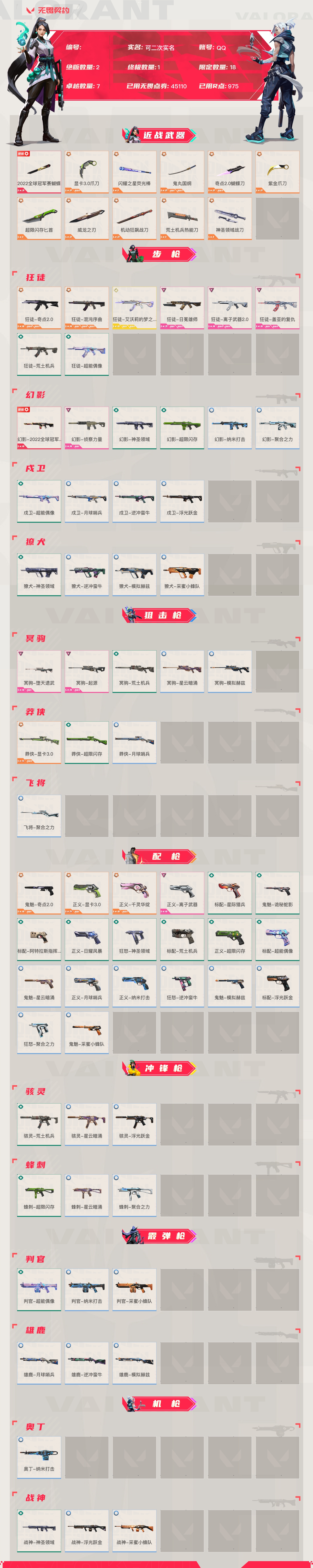 【账号佳】【无畏契约】【编号:39812】【64374g2f2】lv170|未定级, 刀皮数量11,呛皮数量67(绝版2限定18终极1卓越7);皮肤资产价值45110,已用r点975;【刀皮】:近战武器-2022全球冠军赛蝴蝶刀,近战武器-显卡3.0爪刀,近战武器-闪耀之星荧光棒,近战武器-鬼丸国纲,近战武器-奇点2.0蝴蝶刀,近战武器-紫金爪刀,近战武器-超限闪存匕首,近战武器-威龙之刃,近战武器-机动狂飙战刀,近战武器-荒土机兵热能刀,近战武器-神圣领域战刀; 【呛皮】:幻影-2022全球冠军赛,鬼魅-奇点2.0,正义-显卡3.0,正义-千灵华绽,狂徒-奇点2.0,狂徒-混沌序曲,莽侠-显卡3.0,狂徒-艾沃莉的梦之翼,正义-离子武器,狂徒-日冕雄师,狂徒-离子武器2.0,狂徒-盖亚的复仇,幻影-侦察力量,冥驹-堕天遗武,冥驹-起源,标配-星际猎兵,鬼魅-诡秘蛇影,狂徒-荒土机兵,狂徒-超能偶像,幻影-神圣领域,幻影-超限闪存,戍卫-超能偶像,獠犬-神圣领域,冥驹-荒土机兵,莽侠-超限闪存,正义-日耀风暴,正义-超限闪存,标配-阿特拉斯指挥部,标配-荒土机兵,标配-超能偶像,狂怒-神圣领域,骇灵-荒土机兵,蜂刺-超限闪存,判官-超能偶像,战神-神圣领域,幻影-纳米打击,幻影-聚合之力,戍卫-月球哨兵,戍卫-逆冲蛮牛,戍卫-浮光跃金,獠犬-逆冲蛮牛,獠犬-模拟赫兹,獠犬-采蜜小蜂队,冥驹-星云暗涌,冥驹-模拟赫兹,莽侠-月球哨兵,飞将-聚合之力,正义-月球哨兵,正义-纳米打击,鬼魅-星云暗涌,鬼魅-模拟赫兹,鬼魅-采蜜小蜂队,标配-浮光跃金,狂怒-逆冲蛮牛,狂怒-聚合之力,骇灵-星云暗涌,骇灵-浮光跃金,蜂刺-星云暗涌,蜂刺-聚合之力,判官-纳米打击,判官-采蜜小蜂队,雄鹿-月球哨兵,雄鹿-逆冲蛮牛,雄鹿-模拟赫兹,奥丁-纳米打击,战神-浮光跃金,战神-采蜜小蜂队;【热门卡面】:清风徐来卡面,势不可挡盖可卡面,万圣夜卡面,势不可挡星礈卡面,分崩离析卡面,双城之战拥抱卡面,vctcn首冠卡面,rgx11zpro3.0卡面,超能偶像卡面,双城之战金克丝卡面;【热门挂饰】:传世莲华挂饰,809特遣队挂饰,永生玫瑰挂饰,神中神挂饰,数码咒术挂饰,飞刀挂饰,双城之战小蛋糕挂饰,终章ko小金人挂饰,奇点2.0挂饰,袖珍捷风挂饰,rgx11zpro3.0挂饰,糖葫芦挂饰,超能偶像挂饰;【热门喷漆】:2022全球冠军赛喷漆,进击的章鱼2喷漆,真烦人喷漆,捷风喷漆,鼻尖上的蝴蝶喷漆,皮蛋呼呼喷漆,奇点2.0喷漆,小丑猫喷漆,rgx11zpro3.0喷漆,调大音量喷漆,买装还是存钱喷漆,超能偶像喷漆;详情看图【皮肤可能含有某些特权皮肤,具体以游戏内实际拥有为准】【qq】【可二次实名】【官方截图】