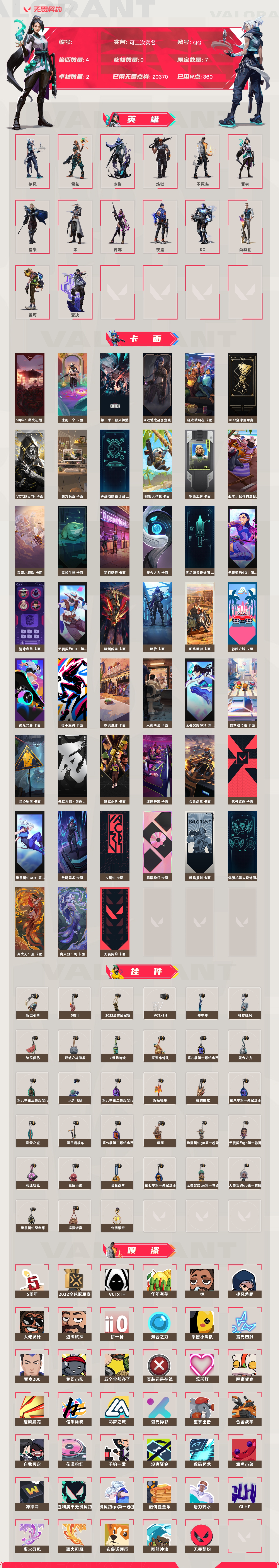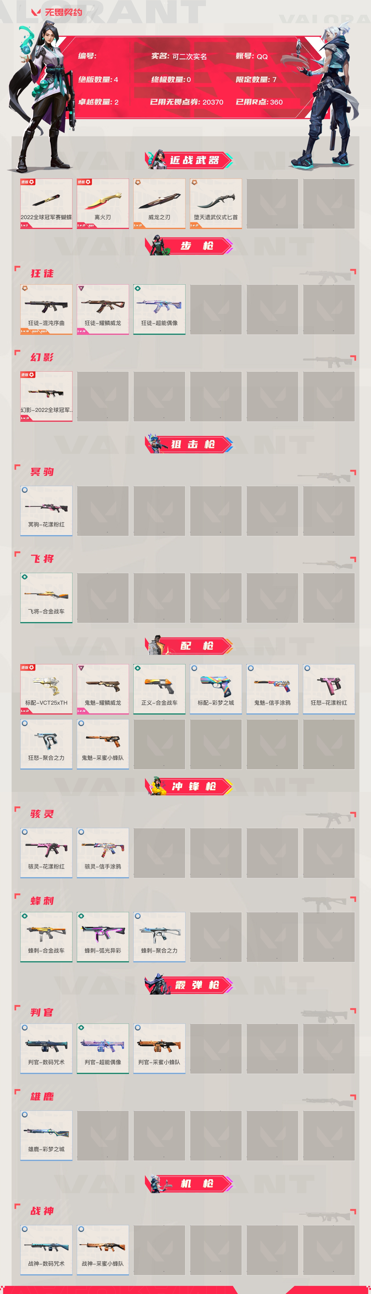 【账号佳】【无畏契约】【编号:39814】【64374add1】lv32|未定级, 刀皮数量4,呛皮数量25(绝版4限定7终极0卓越2);皮肤资产价值20370,已用r点360;【刀皮】:近战武器-2022全球冠军赛蝴蝶刀,近战武器-离火刃,近战武器-威龙之刃,近战武器-堕天遗武仪式匕首; 【呛皮】:标配-vct25xth,幻影-2022全球冠军赛,狂徒-混沌序曲,鬼魅-耀鳞威龙,狂徒-耀鳞威龙,正义-合金战车,蜂刺-合金战车,蜂刺-弧光异彩,飞将-合金战车,标配-彩梦之城,鬼魅-信手涂鸦,狂怒-花漾粉红,骇灵-花漾粉红,骇灵-信手涂鸦,判官-数码咒术,雄鹿-彩梦之城,冥驹-花漾粉红,战神-数码咒术,狂徒-超能偶像,判官-超能偶像,鬼魅-采蜜小蜂队,狂怒-聚合之力,蜂刺-聚合之力,判官-采蜜小蜂队,战神-采蜜小蜂队;【热门卡面】:双城之战金克丝卡面,vct25xth卡面,耀鳞威龙卡面,离火刃凰卡面,离火刃凤卡面;【热门挂饰】:vctxth挂饰,神中神挂饰,袖珍捷风挂饰,双城之战魄罗挂饰,耀鳞威龙挂饰;【热门喷漆】:2022全球冠军赛喷漆,vctxth喷漆,买装还是存钱喷漆,醒狮贺春喷漆,耀鳞威龙喷漆,自我否定喷漆,没有资金喷漆;详情看图【皮肤可能含有某些特权皮肤,具体以游戏内实际拥有为准】【qq】【可二次实名】【官方截图】