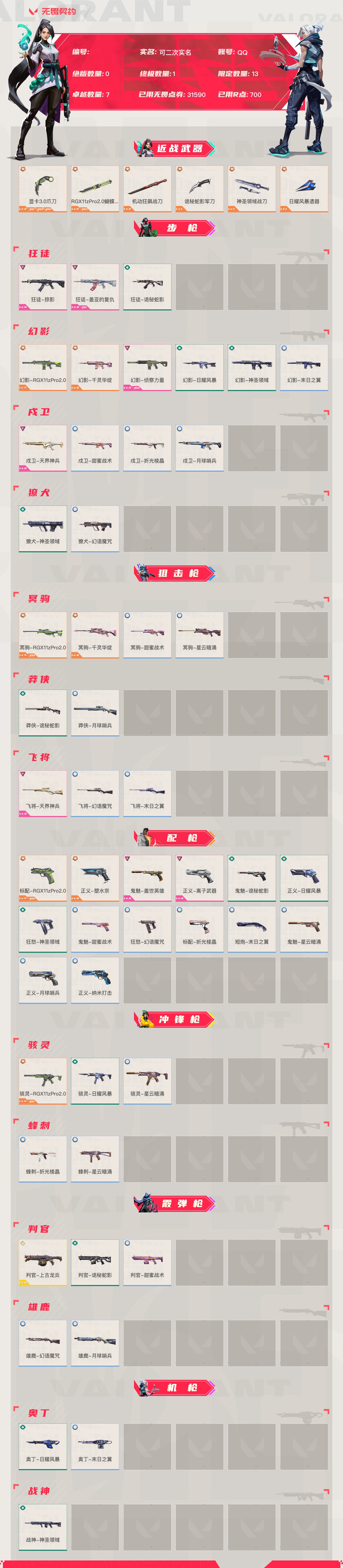 【账号佳】【无畏契约】【编号:39817】【64374bbeg】lv113|未定级, 刀皮数量6,呛皮数量51(绝版0限定13终极1卓越7);皮肤资产价值31590,已用r点700;【刀皮】:近战武器-显卡3.0爪刀,近战武器-rgx11zpro2.0蝴蝶刀,近战武器-机动狂飙战刀,近战武器-诡秘蛇影军刀,近战武器-神圣领域战刀,近战武器-日耀风暴遗器; 【呛皮】:标配-rgx11zpro2.0,正义-塑水宗,骇灵-rgx11zpro2.0,幻影-rgx11zpro2.0,幻影-千灵华绽,冥驹-rgx11zpro2.0,冥驹-千灵华绽,判官-上古龙炎,鬼魅-盖世英雄,正义-离子武器,狂徒-掠影,狂徒-盖亚的复仇,幻影-侦察力量,戍卫-天界神兵,飞将-天界神兵,鬼魅-诡秘蛇影,判官-诡秘蛇影,狂徒-诡秘蛇影,莽侠-诡秘蛇影,幻影-日耀风暴,幻影-神圣领域,獠犬-神圣领域,正义-日耀风暴,狂怒-神圣领域,骇灵-日耀风暴,奥丁-日耀风暴,战神-神圣领域,幻影-末日之翼,戍卫-甜蜜战术,戍卫-折光棱晶,戍卫-月球哨兵,獠犬-幻语魔咒,冥驹-甜蜜战术,冥驹-星云暗涌,莽侠-月球哨兵,飞将-幻语魔咒,飞将-末日之翼,正义-月球哨兵,正义-纳米打击,鬼魅-甜蜜战术,鬼魅-星云暗涌,标配-折光棱晶,短炮-末日之翼,狂怒-幻语魔咒,骇灵-星云暗涌,蜂刺-折光棱晶,蜂刺-星云暗涌,判官-甜蜜战术,雄鹿-幻语魔咒,雄鹿-月球哨兵,奥丁-末日之翼;【热门卡面】:许愿星砂卡面,势不可挡幽影卡面,势不可挡星礈卡面,rgx11zpro2.0卡面,双城之战拥抱卡面;【热门挂饰】:飞刀挂饰,双城之战魄罗挂饰,神中神挂饰,rgx11zpro2.0挂饰,双城之战小蛋糕挂饰,袖珍捷风挂饰;【热门喷漆】:捷风喷漆,捷风跳peek喷漆,秘笈顺序喷漆,真烦人喷漆,rgx11zpro2.0喷漆,买装还是存钱喷漆;详情看图【皮肤可能含有某些特权皮肤,具体以游戏内实际拥有为准】【qq】【可二次实名】【官方截图】