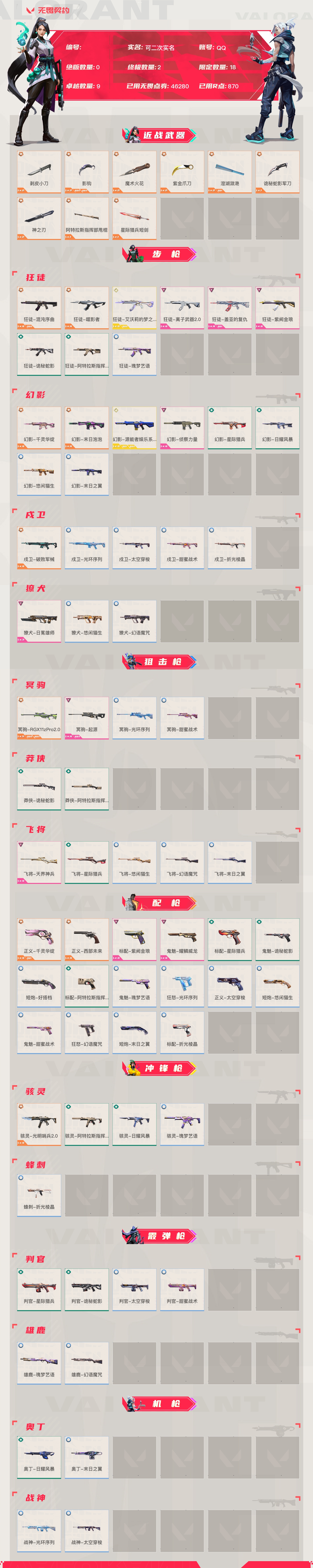 【账号佳】【无畏契约】【编号:39842】【64374hb2c】lv65|未定级, 刀皮数量9,呛皮数量67(绝版0限定18终极2卓越9);皮肤资产价值46280,已用r点870;【刀皮】:近战武器-剥皮小刀,近战武器-影钩,近战武器-魔术火花,近战武器-紫金爪刀,近战武器-澄湖潋滟,近战武器-诡秘蛇影军刀,近战武器-神之刃,近战武器-阿特拉斯指挥部甩棍,近战武器-星际猎兵短剑; 【呛皮】:正义-千灵华绽,正义-西部未来,骇灵-光明哨兵2.0,狂徒-混沌序曲,狂徒-噬影者,幻影-千灵华绽,幻影-末日泡泡,戍卫-破败军械,冥驹-rgx11zpro2.0,狂徒-艾沃莉的梦之翼,幻影-源能者娱乐系统,标配-紫阙金琅,鬼魅-耀鳞威龙,狂徒-离子武器2.0,狂徒-盖亚的复仇,狂徒-紫阙金琅,幻影-侦察力量,獠犬-日冕雄师,冥驹-起源,飞将-天界神兵,标配-星际猎兵,鬼魅-诡秘蛇影,判官-星际猎兵,判官-诡秘蛇影,狂徒-诡秘蛇影,幻影-星际猎兵,飞将-星际猎兵,莽侠-诡秘蛇影,短炮-好搭档,狂徒-阿特拉斯指挥部,幻影-日耀风暴,莽侠-阿特拉斯指挥部,标配-阿特拉斯指挥部,骇灵-阿特拉斯指挥部,骇灵-日耀风暴,奥丁-日耀风暴,狂徒-瑰梦艺语,幻影-悠闲猫生,幻影-末日之翼,戍卫-光环序列,戍卫-太空穿梭,戍卫-甜蜜战术,戍卫-折光棱晶,獠犬-悠闲猫生,獠犬-幻语魔咒,冥驹-光环序列,冥驹-甜蜜战术,飞将-悠闲猫生,飞将-幻语魔咒,飞将-末日之翼,正义-太空穿梭,鬼魅-瑰梦艺语,鬼魅-甜蜜战术,标配-折光棱晶,短炮-悠闲猫生,短炮-末日之翼,狂怒-光环序列,狂怒-幻语魔咒,骇灵-瑰梦艺语,蜂刺-折光棱晶,判官-太空穿梭,判官-甜蜜战术,雄鹿-瑰梦艺语,雄鹿-幻语魔咒,奥丁-末日之翼,战神-光环序列,战神-太空穿梭;【热门卡面】:双城之战金克丝卡面;【热门挂饰】:双城之战魄罗挂饰,云开见日挂饰,神中神挂饰;【热门喷漆】:西奥大逃亡喷漆,捷风跳peek喷漆,纸箱小猫喷漆,一切安好喷漆,买装还是存钱喷漆;详情看图【皮肤可能含有某些特权皮肤,具体以游戏内实际拥有为准】【qq】【可二次实名】【官方截图】