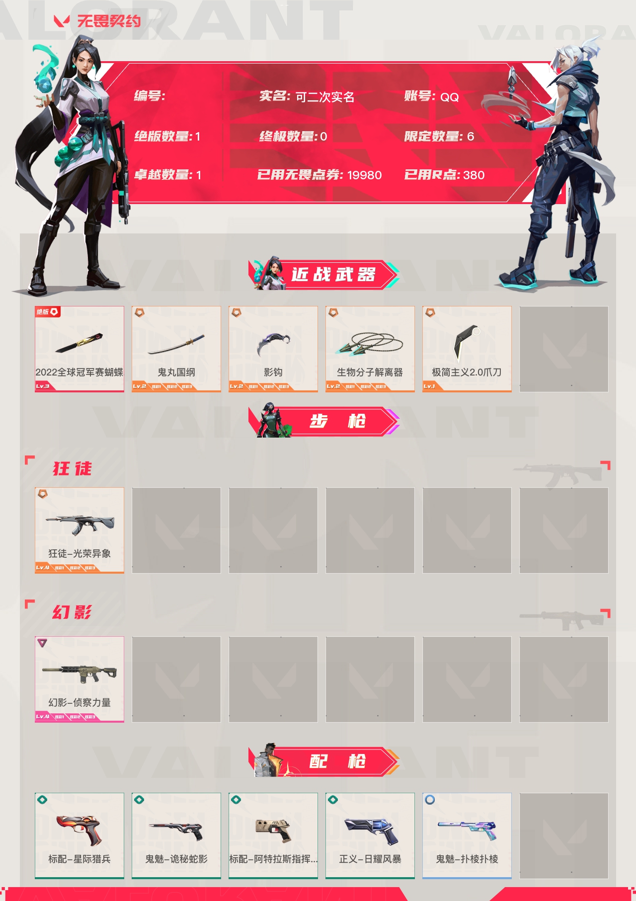 【账号佳】【无畏契约】【编号:39846】【6nll5fbfc】lv96|未定级, 刀皮数量5,呛皮数量7(绝版1限定6终极0卓越1);皮肤资产价值19980,已用r点380;【刀皮】:近战武器-2022全球冠军赛蝴蝶刀,近战武器-鬼丸国纲,近战武器-影钩,近战武器-生物分子解离器,近战武器-极简主义2.0爪刀; 【呛皮】:狂徒-光荣异象,幻影-侦察力量,标配-星际猎兵,鬼魅-诡秘蛇影,正义-日耀风暴,标配-阿特拉斯指挥部,鬼魅-扑棱扑棱;【热门卡面】:双城之战拥抱卡面;【热门挂饰】:金属蝶翼挂饰,神中神挂饰,双城之战小蛋糕挂饰,袖珍捷风挂饰,幸运中国结挂饰;【热门喷漆】:秘笈顺序喷漆,来点朋克喷漆,买装还是存钱喷漆,醒狮贺春喷漆;详情看图【皮肤可能含有某些特权皮肤,具体以游戏内实际拥有为准】【qq】【可二次实名】【官方截图】