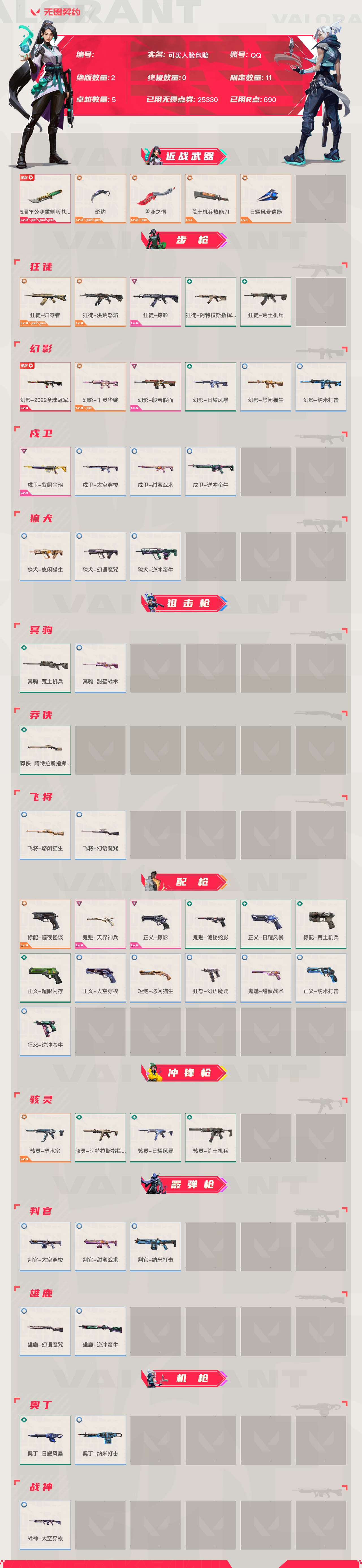 【账号佳】【无畏契约】【编号:39883】【69sjvg211】lv90|未定级, 刀皮数量5,呛皮数量48(绝版2限定11终极0卓越5);皮肤资产价值25330,已用r点690;【刀皮】:近战武器-5周年公测重制版苍龙之刃,近战武器-影钩,近战武器-盖亚之愠,近战武器-荒土机兵热能刀,近战武器-日耀风暴遗器; 【呛皮】:幻影-2022全球冠军赛,标配-黯夜怪谈,骇灵-塑水宗,狂徒-归零者,狂徒-洪荒怒焰,幻影-千灵华绽,鬼魅-天界神兵,正义-掠影,狂徒-掠影,幻影-般若假面,戍卫-紫阙金琅,鬼魅-诡秘蛇影,狂徒-阿特拉斯指挥部,狂徒-荒土机兵,幻影-日耀风暴,冥驹-荒土机兵,莽侠-阿特拉斯指挥部,正义-日耀风暴,正义-超限闪存,标配-荒土机兵,骇灵-阿特拉斯指挥部,骇灵-日耀风暴,骇灵-荒土机兵,奥丁-日耀风暴,幻影-悠闲猫生,幻影-纳米打击,戍卫-太空穿梭,戍卫-甜蜜战术,戍卫-逆冲蛮牛,獠犬-悠闲猫生,獠犬-幻语魔咒,獠犬-逆冲蛮牛,冥驹-甜蜜战术,飞将-悠闲猫生,飞将-幻语魔咒,正义-太空穿梭,正义-纳米打击,鬼魅-甜蜜战术,短炮-悠闲猫生,狂怒-幻语魔咒,狂怒-逆冲蛮牛,判官-太空穿梭,判官-甜蜜战术,判官-纳米打击,雄鹿-幻语魔咒,雄鹿-逆冲蛮牛,奥丁-纳米打击,战神-太空穿梭;【热门卡面】:双城之战金克丝卡面,分崩离析卡面,双城之战拥抱卡面;【热门挂饰】:双城之战魄罗挂饰,神中神挂饰,双城之战小蛋糕挂饰,终章ko小金人挂饰,蓄势待滚挂饰;【热门喷漆】:捷风跳peek喷漆,鼻尖上的蝴蝶喷漆,买装还是存钱喷漆,小丑猫喷漆;详情看图【皮肤可能含有某些特权皮肤,具体以游戏内实际拥有为准】【qq】【可买人脸包赔】【官方截图】
