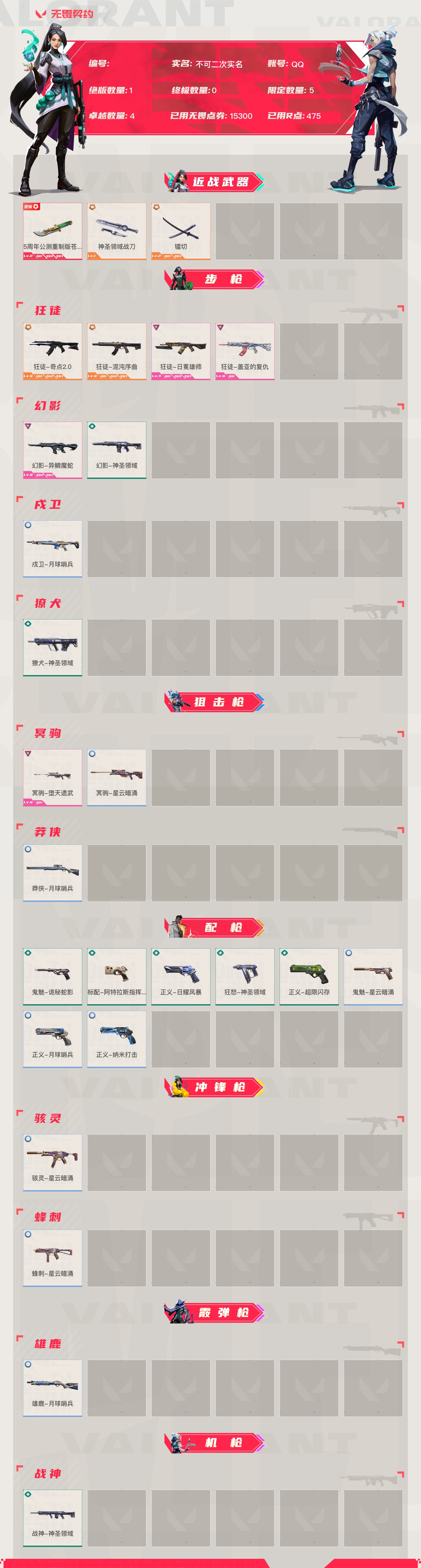 【账号佳】【无畏契约】【编号:39888】【69sjvagfg】lv106|未定级, 刀皮数量3,呛皮数量23(绝版1限定5终极0卓越4);皮肤资产价值15300,已用r点475;【刀皮】:近战武器-5周年公测重制版苍龙之刃,近战武器-神圣领域战刀,近战武器-镭切; 【呛皮】:狂徒-奇点2.0,狂徒-混沌序曲,狂徒-日冕雄师,狂徒-盖亚的复仇,幻影-异鳞魔蛇,冥驹-堕天遗武,鬼魅-诡秘蛇影,幻影-神圣领域,獠犬-神圣领域,正义-日耀风暴,正义-超限闪存,标配-阿特拉斯指挥部,狂怒-神圣领域,战神-神圣领域,戍卫-月球哨兵,冥驹-星云暗涌,莽侠-月球哨兵,正义-月球哨兵,正义-纳米打击,鬼魅-星云暗涌,骇灵-星云暗涌,蜂刺-星云暗涌,雄鹿-月球哨兵;【热门卡面】:双城之战金克丝卡面,势不可挡芮娜卡面,势不可挡星礈卡面,双城之战拥抱卡面,虹吸式咖啡壶卡面,势不可挡捷风卡面;【热门挂饰】:神中神挂饰,双城之战小蛋糕挂饰,终章ko小金人挂饰,袖珍捷风挂饰;【热门喷漆】:撸到秃喷漆,真烦人喷漆,买装还是存钱喷漆,秘笈顺序喷漆,小丑猫喷漆;详情看图【皮肤可能含有某些特权皮肤,具体以游戏内实际拥有为准】【qq】【不可二次实名】【官方截图】