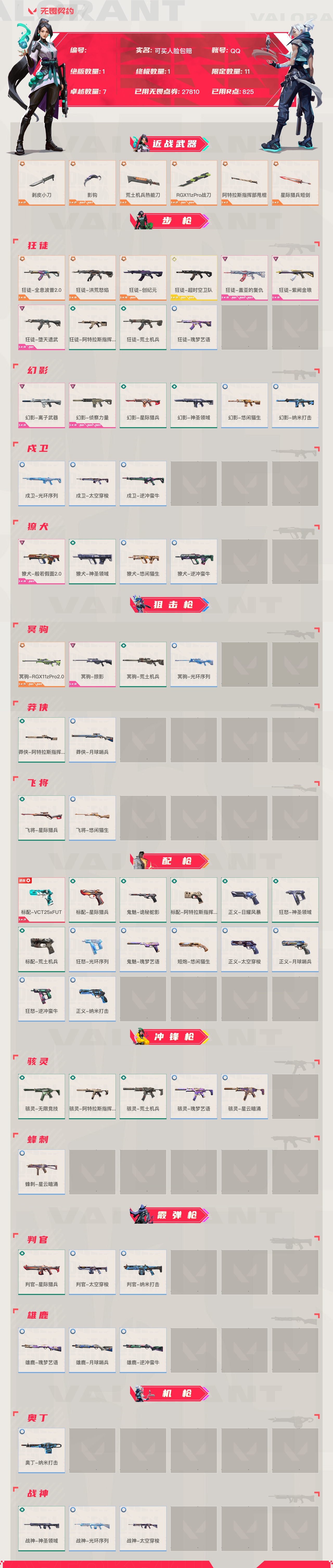 【账号佳】【无畏契约】【编号:39889】【69sjvbace】lv116|未定级, 刀皮数量6,呛皮数量61(绝版1限定11终极1卓越7);皮肤资产价值27810,已用r点825;【刀皮】:近战武器-剥皮小刀,近战武器-影钩,近战武器-荒土机兵热能刀,近战武器-rgx11zpro战刀,近战武器-阿特拉斯指挥部甩棍,近战武器-星际猎兵短剑; 【呛皮】:标配-vct25xfut,狂徒-全息波普2.0,狂徒-洪荒怒焰,狂徒-创纪元,冥驹-rgx11zpro2.0,狂徒-超时空卫队,狂徒-盖亚的复仇,狂徒-紫阙金琅,狂徒-堕天遗武,幻影-离子武器,幻影-侦察力量,獠犬-般若假面2.0,冥驹-掠影,标配-星际猎兵,鬼魅-诡秘蛇影,骇灵-无限竞技,判官-星际猎兵,幻影-星际猎兵,飞将-星际猎兵,狂徒-阿特拉斯指挥部,狂徒-荒土机兵,幻影-神圣领域,獠犬-神圣领域,冥驹-荒土机兵,莽侠-阿特拉斯指挥部,正义-日耀风暴,标配-阿特拉斯指挥部,标配-荒土机兵,狂怒-神圣领域,骇灵-阿特拉斯指挥部,骇灵-荒土机兵,战神-神圣领域,狂徒-瑰梦艺语,幻影-悠闲猫生,幻影-纳米打击,戍卫-光环序列,戍卫-太空穿梭,戍卫-逆冲蛮牛,獠犬-悠闲猫生,獠犬-逆冲蛮牛,冥驹-光环序列,莽侠-月球哨兵,飞将-悠闲猫生,正义-太空穿梭,正义-月球哨兵,正义-纳米打击,鬼魅-瑰梦艺语,短炮-悠闲猫生,狂怒-光环序列,狂怒-逆冲蛮牛,骇灵-瑰梦艺语,骇灵-星云暗涌,蜂刺-星云暗涌,判官-太空穿梭,判官-纳米打击,雄鹿-瑰梦艺语,雄鹿-月球哨兵,雄鹿-逆冲蛮牛,奥丁-纳米打击,战神-光环序列,战神-太空穿梭;【热门卡面】:势不可挡捷风卡面,势不可挡贤者卡面,势不可挡蝰蛇卡面,vct25xfut卡面,分崩离析卡面,双城之战拥抱卡面;【热门挂饰】:vctxfut挂饰,v25第三幕超凡挂饰,神中神挂饰,爱与和平挂饰,双城之战小蛋糕挂饰;【热门喷漆】:vctxfut喷漆,纸箱小猫喷漆,买装还是存钱喷漆,真烦人喷漆,飓刃涂鸦喷漆,鼻尖上的蝴蝶喷漆;详情看图【皮肤可能含有某些特权皮肤,具体以游戏内实际拥有为准】【qq】【可买人脸包赔】【官方截图】