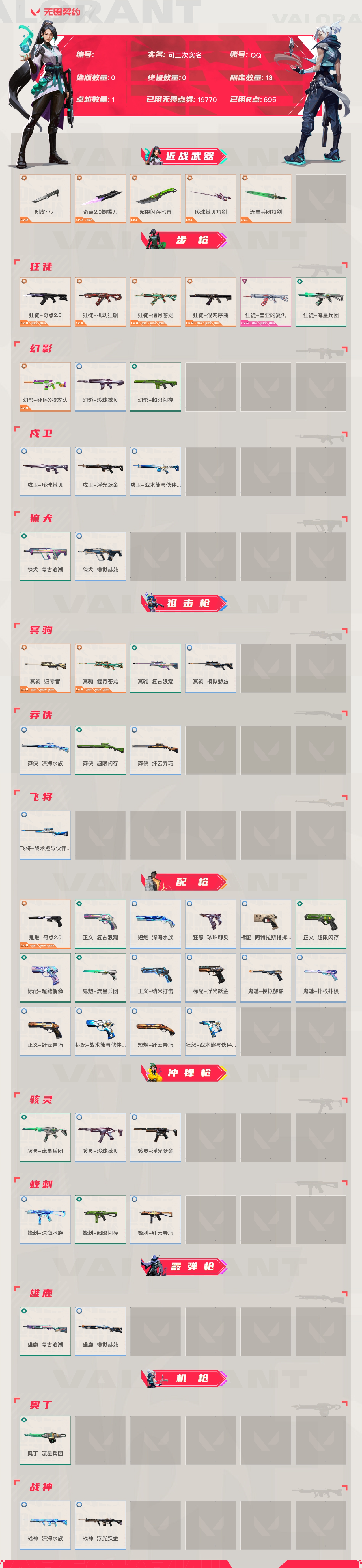 【账号佳】【无畏契约】【编号:41033】【69x8jaeb1】lv127|未定级, 刀皮数量5,呛皮数量49(绝版0限定13终极0卓越1);皮肤资产价值19770,已用r点695;【刀皮】:近战武器-剥皮小刀,近战武器-奇点2.0蝴蝶刀,近战武器-超限闪存匕首,近战武器-珍珠棘贝短剑,近战武器-流星兵团短剑; 【呛皮】:鬼魅-奇点2.0,狂徒-奇点2.0,狂徒-机动狂飙,狂徒-偃月苍龙,狂徒-混沌序曲,幻影-砰砰x特攻队,冥驹-归零者,冥驹-偃月苍龙,狂徒-盖亚的复仇,正义-复古浪潮,骇灵-流星兵团,雄鹿-复古浪潮,獠犬-复古浪潮,冥驹-复古浪潮,短炮-深海水族,狂怒-珍珠棘贝,骇灵-珍珠棘贝,蜂刺-深海水族,幻影-珍珠棘贝,戍卫-珍珠棘贝,莽侠-深海水族,战神-深海水族,狂徒-流星兵团,幻影-超限闪存,莽侠-超限闪存,正义-超限闪存,鬼魅-流星兵团,标配-阿特拉斯指挥部,标配-超能偶像,蜂刺-超限闪存,奥丁-流星兵团,戍卫-浮光跃金,戍卫-战术熊与伙伴们,獠犬-模拟赫兹,冥驹-模拟赫兹,莽侠-纤云弄巧,飞将-战术熊与伙伴们,正义-纳米打击,正义-纤云弄巧,鬼魅-模拟赫兹,鬼魅-扑棱扑棱,标配-浮光跃金,标配-战术熊与伙伴们,短炮-纤云弄巧,狂怒-战术熊与伙伴们,骇灵-浮光跃金,蜂刺-纤云弄巧,雄鹿-模拟赫兹,战神-浮光跃金;【热门卡面】:势不可挡芮娜卡面,双城之战拥抱卡面,无畏契约吉祥物卡面,虹吸式咖啡壶卡面,清风徐来卡面;【热门挂饰】:双城之战小蛋糕挂饰,终章ko小金人挂饰,奇点2.0挂饰,袖珍捷风挂饰,糖葫芦挂饰,金属蝶翼挂饰,迷你机甲挂饰,云开见日挂饰,传世莲华挂饰;【热门喷漆】:一切安好喷漆,皮蛋呼呼喷漆,奇点2.0喷漆,小丑猫喷漆,来点朋克喷漆,开心到爆炸喷漆,皮蛋萌舞喷漆,别挡我的路喷漆,情绪控制喷漆,双人比心喷漆,买装还是存钱喷漆,双击点赞喷漆,醒狮贺春喷漆;详情看图【皮肤可能含有某些特权皮肤,具体以游戏内实际拥有为准】【qq】【可二次实名】【官方截图】