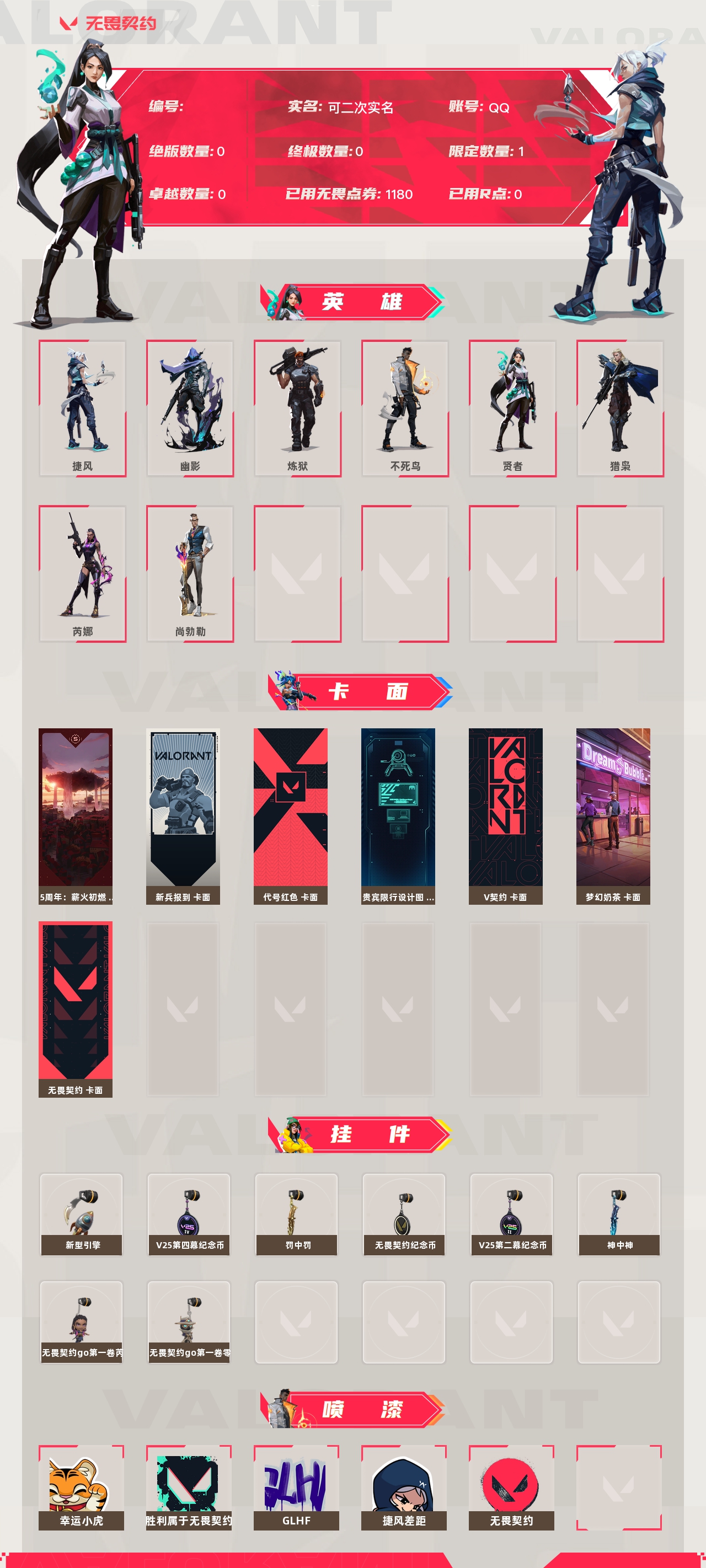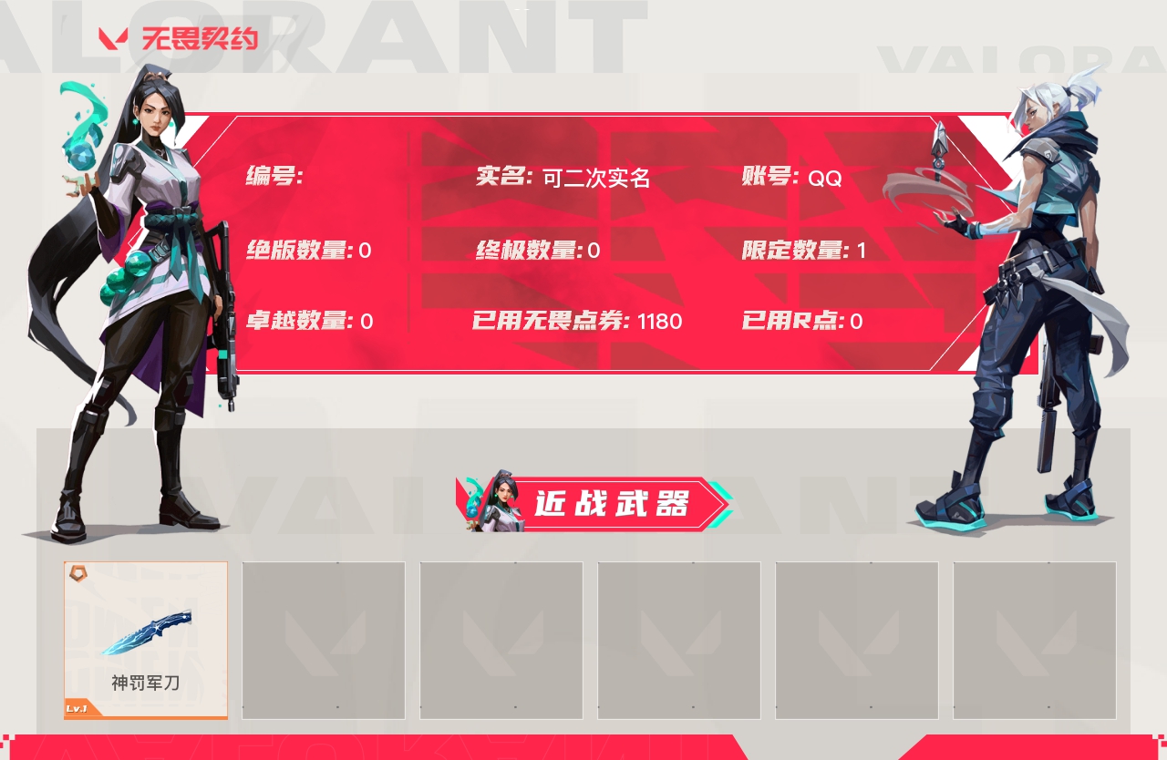 【账号佳】【无畏契约】【编号:41036】【69x8jcaee】lv12|未定级, 刀皮数量1,呛皮数量0(绝版0限定1终极0卓越0);皮肤资产价值1180,已用r点0;【刀皮】:近战武器-神罚军刀; 【热门挂饰】:神中神挂饰;详情看图【皮肤可能含有某些特权皮肤,具体以游戏内实际拥有为准】【qq】【可二次实名】【官方截图】