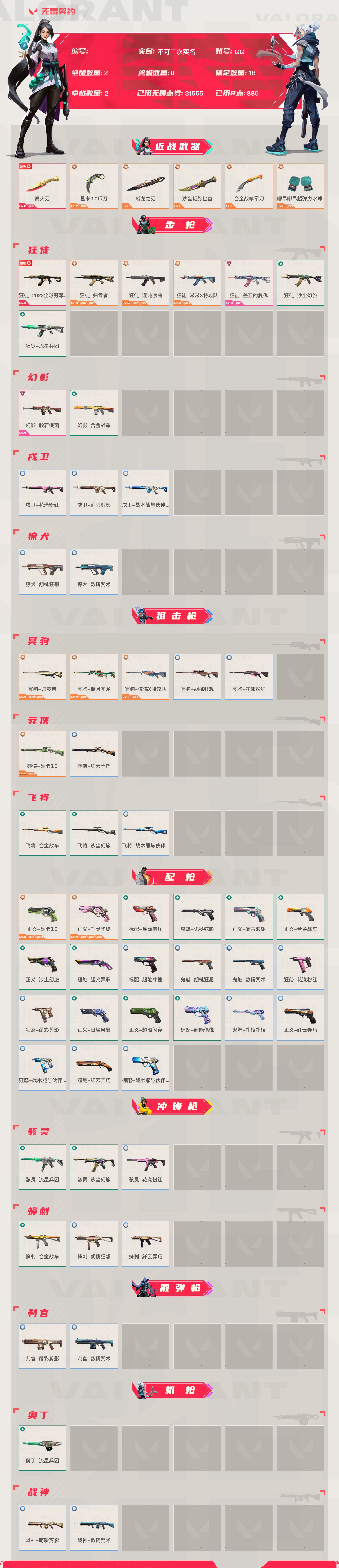 【账号佳】【无畏契约】【编号:41037】【69x8jbaae】lv166|未定级, 刀皮数量6,呛皮数量56(绝版2限定16终极0卓越2);皮肤资产价值31555,已用r点885;【刀皮】:近战武器-离火刃,近战武器-显卡3.0爪刀,近战武器-威龙之刃,近战武器-沙尘幻旅匕首,近战武器-合金战车军刀,近战武器-嘟昂嘟昂超弹力水球拳套; 【呛皮】:狂徒-2023全球冠军赛,正义-显卡3.0,正义-千灵华绽,狂徒-归零者,狂徒-混沌序曲,狂徒-滋滋x特攻队,冥驹-归零者,冥驹-偃月苍龙,冥驹-滋滋x特攻队,莽侠-显卡3.0,狂徒-盖亚的复仇,幻影-般若假面,标配-星际猎兵,鬼魅-诡秘蛇影,正义-复古浪潮,正义-合金战车,正义-沙尘幻旅,短炮-弧光异彩,骇灵-流星兵团,骇灵-沙尘幻旅,蜂刺-合金战车,狂徒-沙尘幻旅,幻影-合金战车,飞将-合金战车,飞将-沙尘幻旅,标配-超能冲撞,鬼魅-胡桃狂想,鬼魅-数码咒术,狂怒-花漾粉红,狂怒-萌彩剪影,骇灵-花漾粉红,蜂刺-胡桃狂想,判官-萌彩剪影,判官-数码咒术,戍卫-花漾粉红,戍卫-萌彩剪影,獠犬-胡桃狂想,獠犬-数码咒术,冥驹-胡桃狂想,冥驹-花漾粉红,战神-萌彩剪影,战神-数码咒术,狂徒-流星兵团,正义-日耀风暴,正义-超限闪存,标配-超能偶像,奥丁-流星兵团,戍卫-战术熊与伙伴们,莽侠-纤云弄巧,飞将-战术熊与伙伴们,正义-纤云弄巧,鬼魅-扑棱扑棱,标配-战术熊与伙伴们,短炮-纤云弄巧,狂怒-战术熊与伙伴们,蜂刺-纤云弄巧;【热门卡面】:势不可挡捷风卡面,rgx11zpro3.0卡面,情人节猎枭卡面,情人节不死鸟卡面,势不可挡ko卡面,势不可挡零卡面,离火刃凰卡面,离火刃凤卡面;【热门挂饰】:神中神挂饰,终章ko小金人挂饰,糖葫芦挂饰,袖珍捷风挂饰,永结同心挂饰,rgx11zpro3.0挂饰,金属蝶翼挂饰,迷你机甲挂饰,古代传承挂饰,云开见日挂饰,传世莲华挂饰,打不烂的挂饰,针织蜜蜂挂饰,冬日絮语挂饰,高音谱号挂饰,幸运中国结挂饰,蓄势待滚挂饰,数码咒术挂饰;【热门喷漆】:打松鼠喷漆,无条件投降喷漆,小丑猫喷漆,九命灵猫喷漆,想都别想喷漆,比心喷漆,rgx11zpro3.0喷漆,开心到爆炸喷漆,皮蛋萌舞喷漆,别挡我的路喷漆,来点朋克喷漆,买装还是存钱喷漆,双击点赞喷漆,醒狮贺春喷漆,这招不行了喷漆,红牌退场喷漆,口袋贤者喷漆,鞠躬喷漆,目瞪口呆喷漆,纸箱小猫喷漆,自我否定喷漆,没有资金喷漆;详情看图【皮肤可能含有某些特权皮肤,具体以游戏内实际拥有为准】【qq】【不可二次实名】【官方截图】