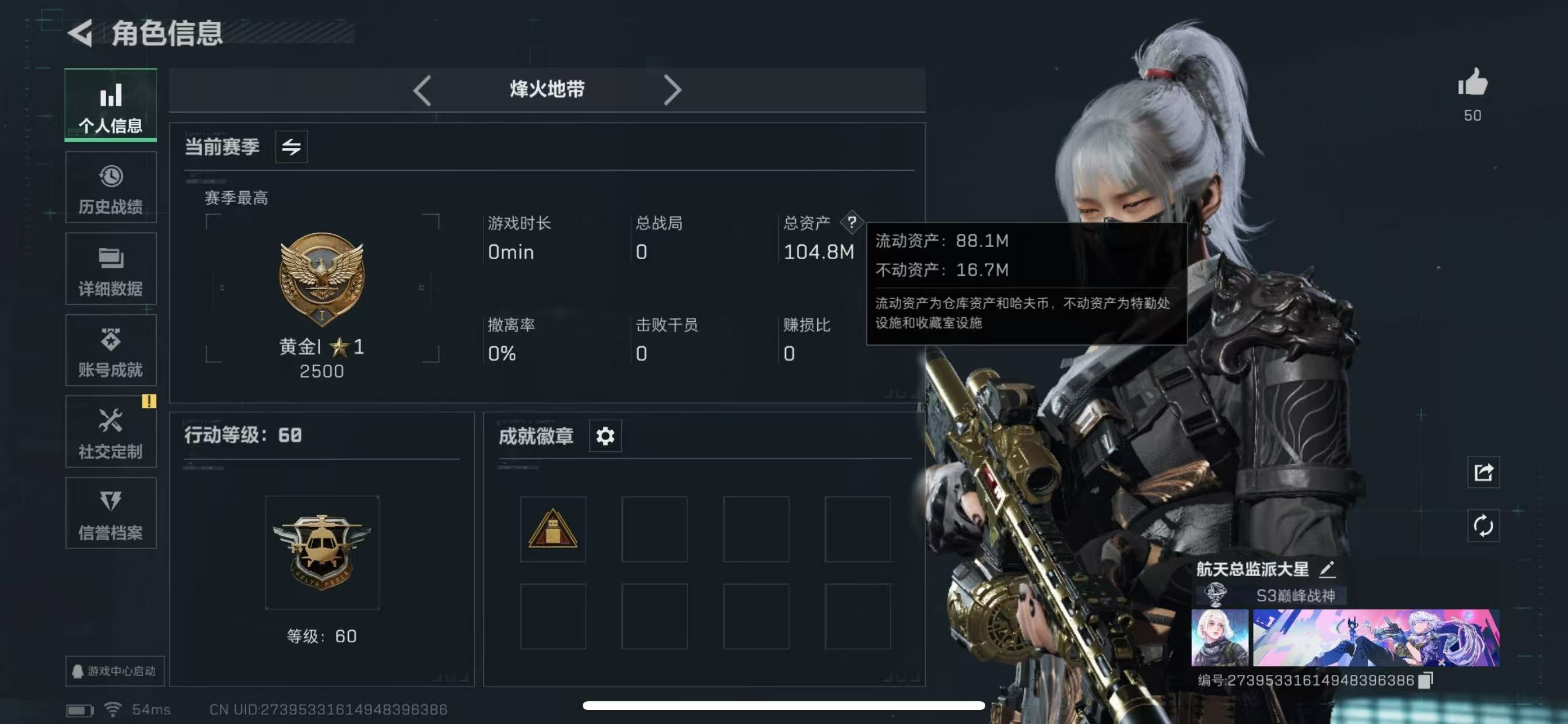 【账号佳】【三角洲行动】【编号:12427】汤15798总资产104M,哈夫币18w,近战-黑海/红狼-蚀金玫瑰/骇爪-水墨云图,仓库lv7,靶场lv6,训练中心lv6,详情看图;