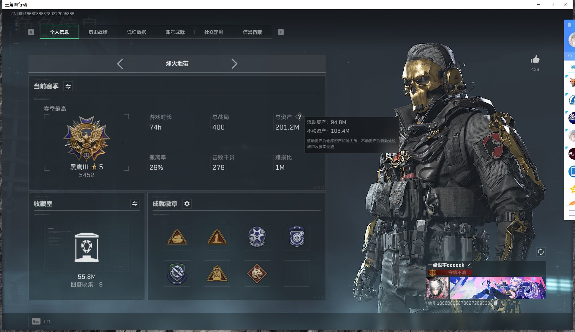 【账号佳】【三角洲行动】【编号:13311】精品全员红皮/三刀皮香香号/总资产200M/流动资金94M/13.6w代币/北极星捆绑包/电锯捆绑包/黑海捆绑包/仓库9级/指挥中心满级/训练中心满级/靶场满级/潜水中心满级/收藏室1级/部门任务33433级/蚀金玫瑰/电锯惊魂/飞虎/壮志凌云/夜鹰/送葬人/午夜邮差/天际线/水墨云图/维什戴尔/王牌之剑白桃威龙极品B/K4165优品S/M7优品B/267枪皮/